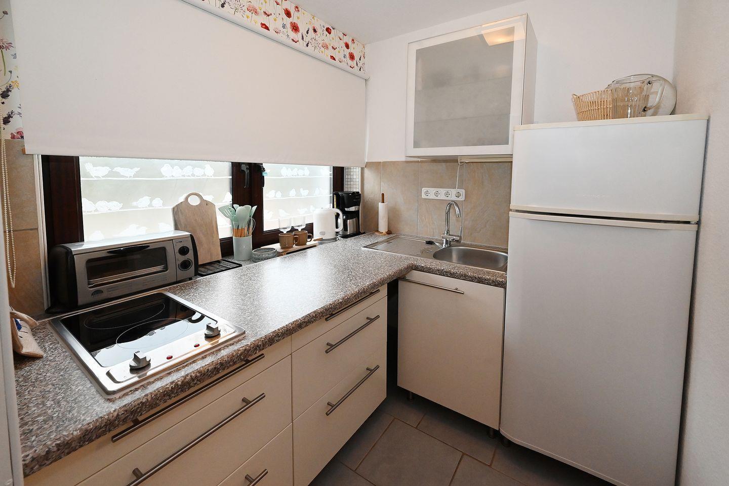 Die Küche ist mit allem ausgestattet, was Sie brauchen: einem Cerankochfeld, Mikrowelle, Kühlschrank, Gefrierfach, und allen notwendigen Küchenutensilien.