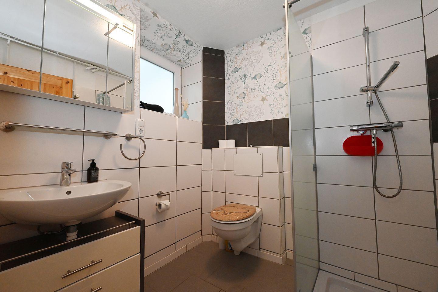 Die Wohnung verfügt über ein komfortables Schlafzimmer und ein modernes Badezimmer mit Dusche.