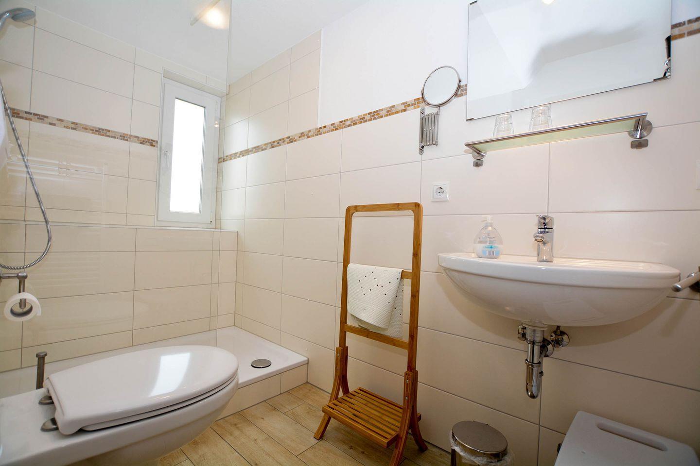 Das Schlafzimmer ist mit einem gemütlichen Doppelbett ausgestattet, das Ihnen eine erholsame Nachtruhe garantiert. Der hochwertige Laminatboden sorgt für eine angenehme Atmosphäre, während der Sichtschutz an den Fenstern Privatsphäre und Ruhe bietet. Das Tageslichtbadezimmer ist modern und verfügt über eine bodengleiche Dusche, ein Waschbecken, WC sowie einen Haartrockner – alles, was Sie für Ihren Aufenthalt benötigen.