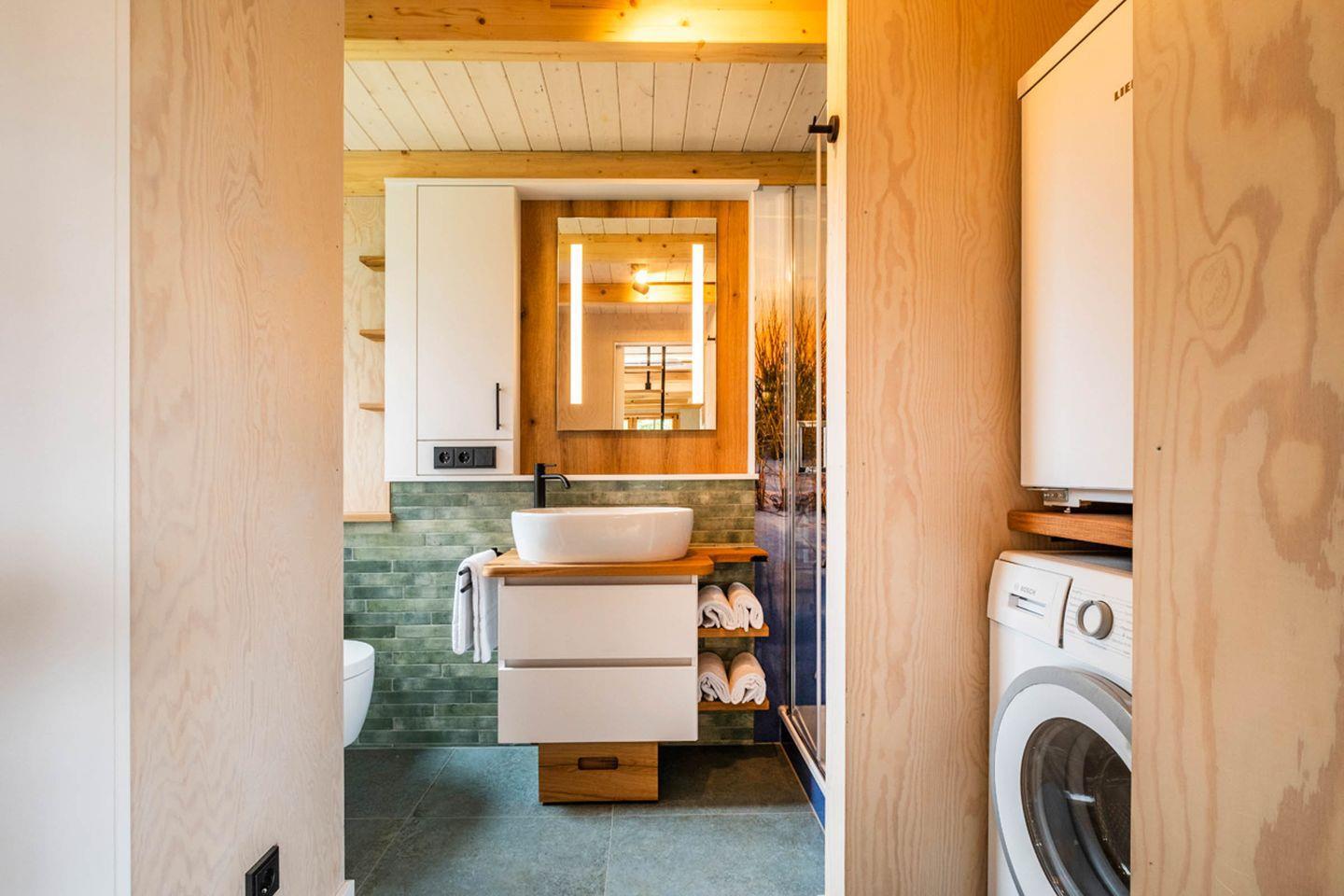 Das Tiny-House besticht durch seine moderne und gemütliche Ausstattung. Die beiden Schlafzimmer sind einladend und komfortabel eingerichtet, sodass erholsame Nächte garantiert sind. Eines der Schlafzimmer verfügt über ein Doppelbett. Im zweiten Schlafzimmer finden Sie zwei Einzelbette. Der offene Wohnbereich mit einem bequemen Sofa und einem Esstisch lädt zum gemeinsamen Verweilen ein. Hier können Sie nach einem aufregenden Tag an der Küste entspannen und gemütliche Abende verbringen. Der Fernseher im Wohnbereich sorgt für Unterhaltung, während die Küche mit allen notwendigen Annehmlichkeiten ausgestattet ist, sodass Sie Ihre eigenen Mahlzeiten zubereiten können. Ein modernes Badezimmer rundet das Wohnkonzept ab.
