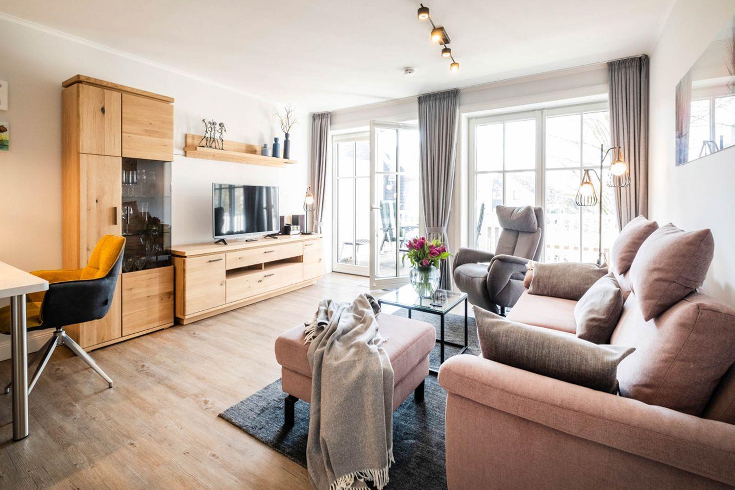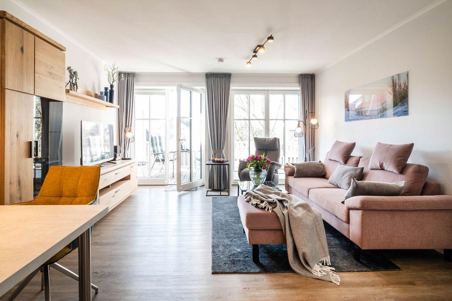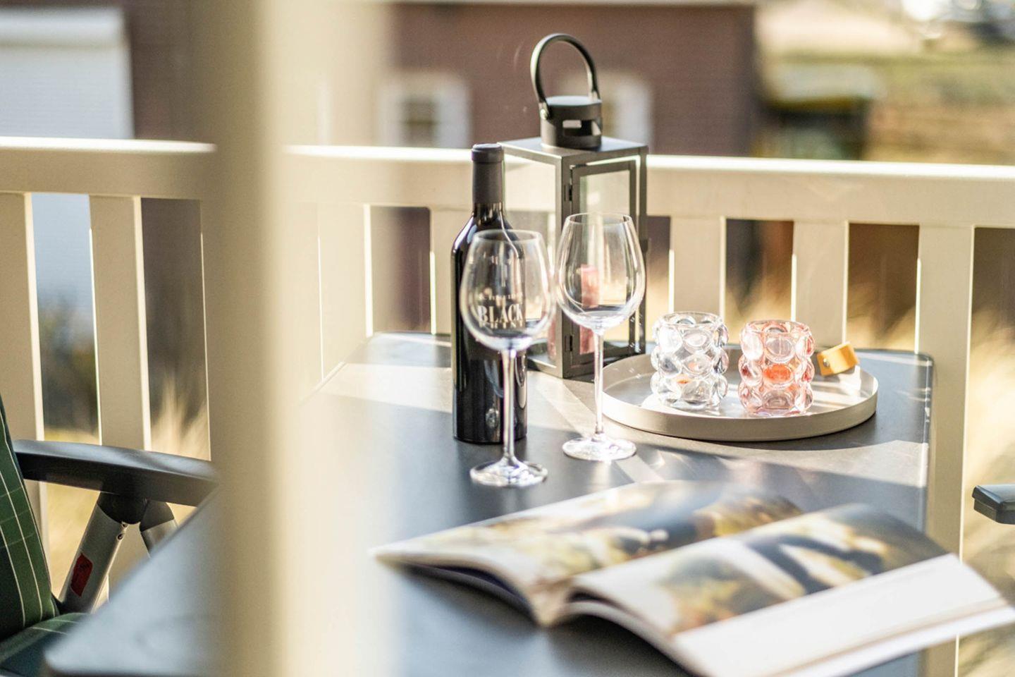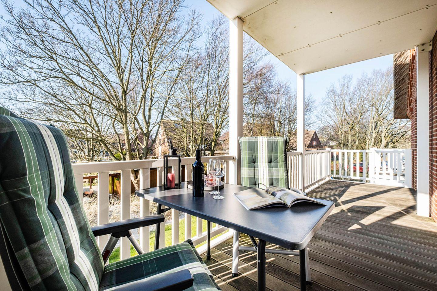 Ein besonderes Highlight ist der große Balkon mit Gartenmöbeln, die nicht nur zum Entspannen, sondern auch zum Genießen der frischen Nordseeluft einlädt. Hier können Sie die Sonnenstrahlen unter einem Sonnenschirm genießen oder den Abend bei einem Glas Wein ausklingen lassen.