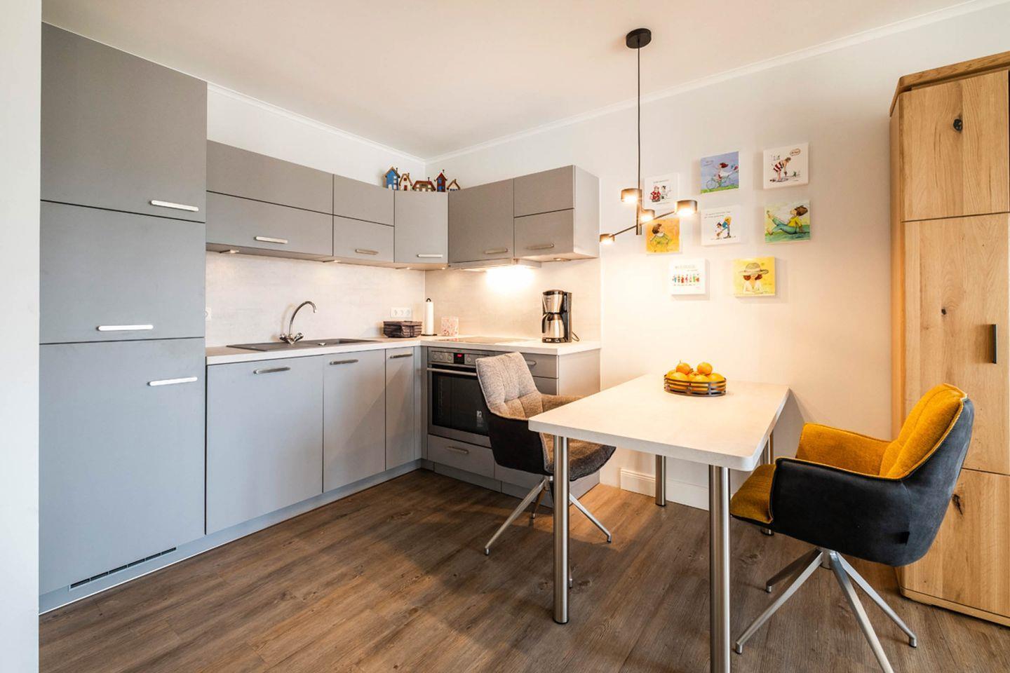 Die Ferienwohnung befindet sich im 1. Obergeschoss eines gepflegten Hauses und ist bequem mit einem Aufzug zu erreichen. Der offen gestaltete Wohnbereich vereint Funktionalität und Gemütlichkeit. Hier finden Sie eine moderne Küche, die mit hochwertigen Geräten wie einem Cerankochfeld, einer Mikrowelle, einem Geschirrspüler und einer Kaffeemaschine ausgestattet ist. Nach einem erlebnisreichen Tag können Sie am Esstisch eine köstliche Mahlzeit genießen oder auf der gemütlichen Couch entspannen. Für Unterhaltung sorgt ein Fernseher, sodass Sie Ihre Lieblingsfilme oder Serien auch in der Ferne nicht missen müssen.