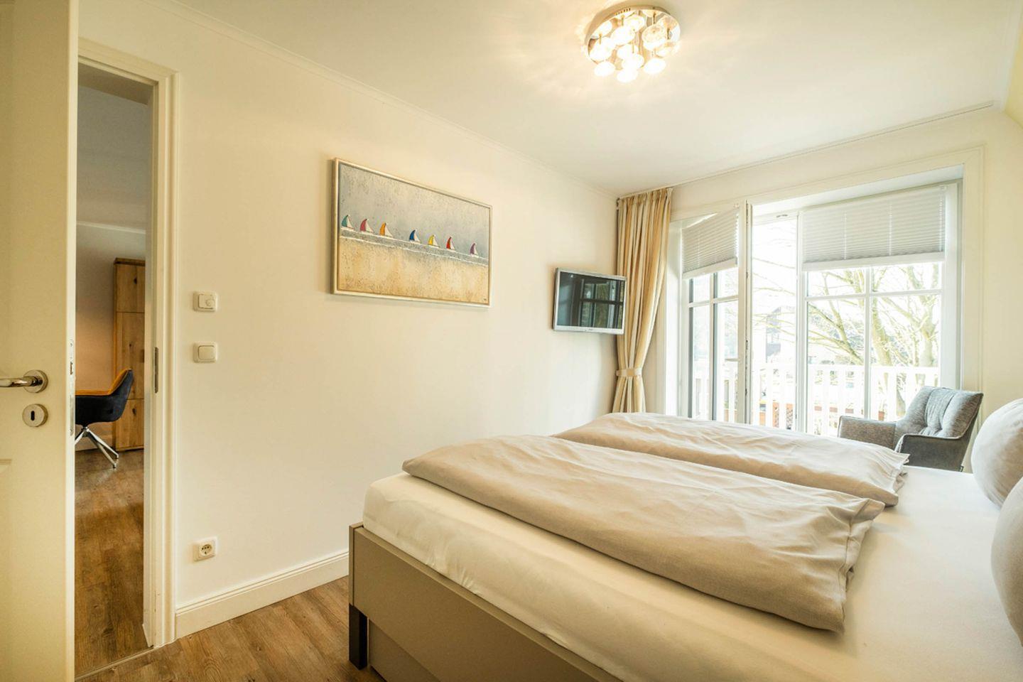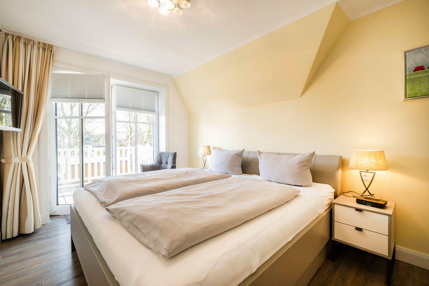 Das Schlafzimmer überzeugt mit einem komfortablen Bett und einer ruhigen Atmosphäre, die zum Ausruhen einlädt. Zudem ist das Apartment allergikergeeignet und bietet eine Hochwertigkeit, die Sie während Ihres Aufenthalts schätzen werden. Das Badezimmer ist mit einer bodengleichen Dusche, einem Haartrockner und Kosmetikspiegel ausgestattet, sodass Sie sich wohlfühlen können.
