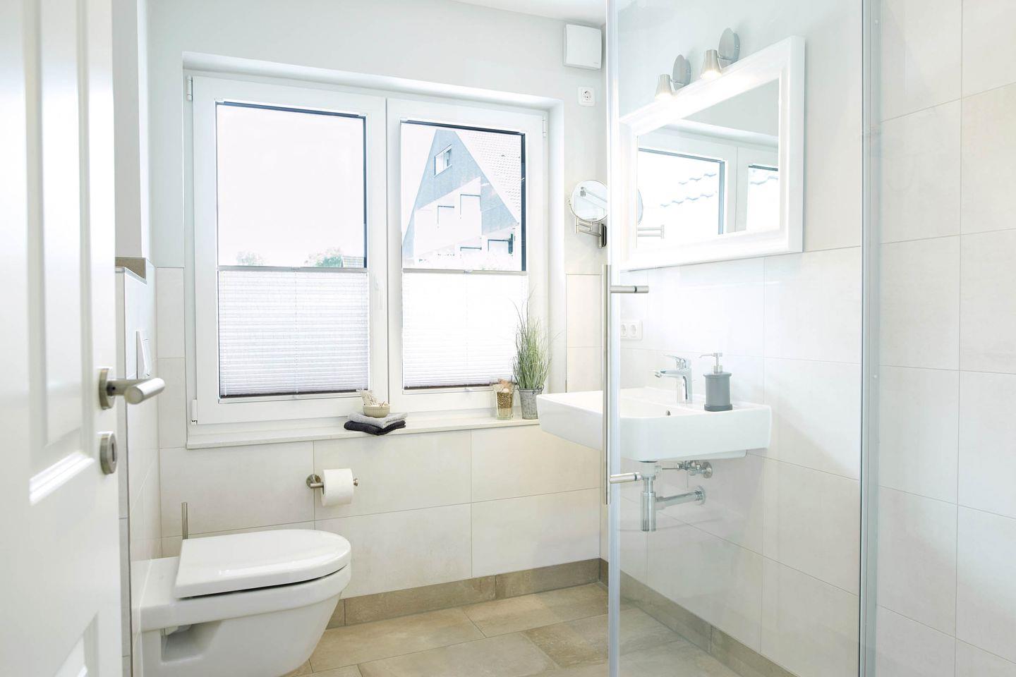 Das moderne tageslicht Badezimmer überzeugt durch eine bodengleiche Dusche, ein WC, Waschbecken und warmes Wasser. Hier finden Sie auch einen Haartrockner sowie einen großen Spiegel.