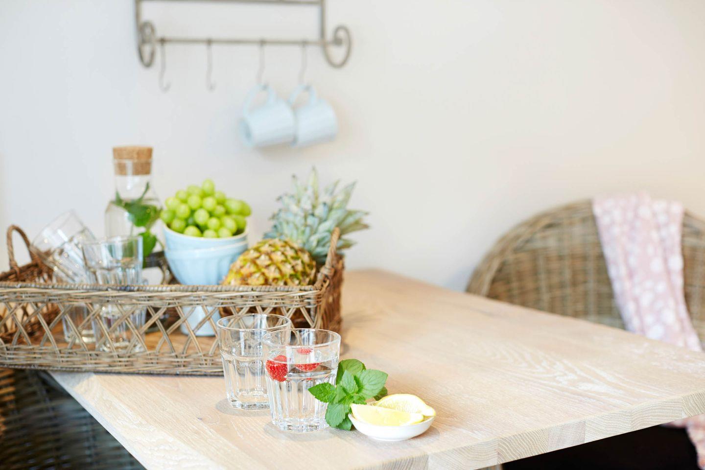 Die geschlossene Küche ist komplett ausgestattet und lässt kaum Wünsche offen. Neben einem geräumigen Kühlschrank und einem Ceran-Herd finden Sie auch einen Backofen, eine Spülmaschine sowie sämtliche Küchenutensilien, die Sie für die Zubereitung eigener Mahlzeiten benötigen. Eine Kaffeemaschine und ein Wasserkocher stehen ebenfalls zur Verfügung, um Ihren Tag mit einem frisch gebrühten Kaffee zu beginnen. Das Esszimmer mit Esstisch und Stühlen ist der perfekte Ort, um gemeinsam zu speisen und den Aufenthalt zu genießen.