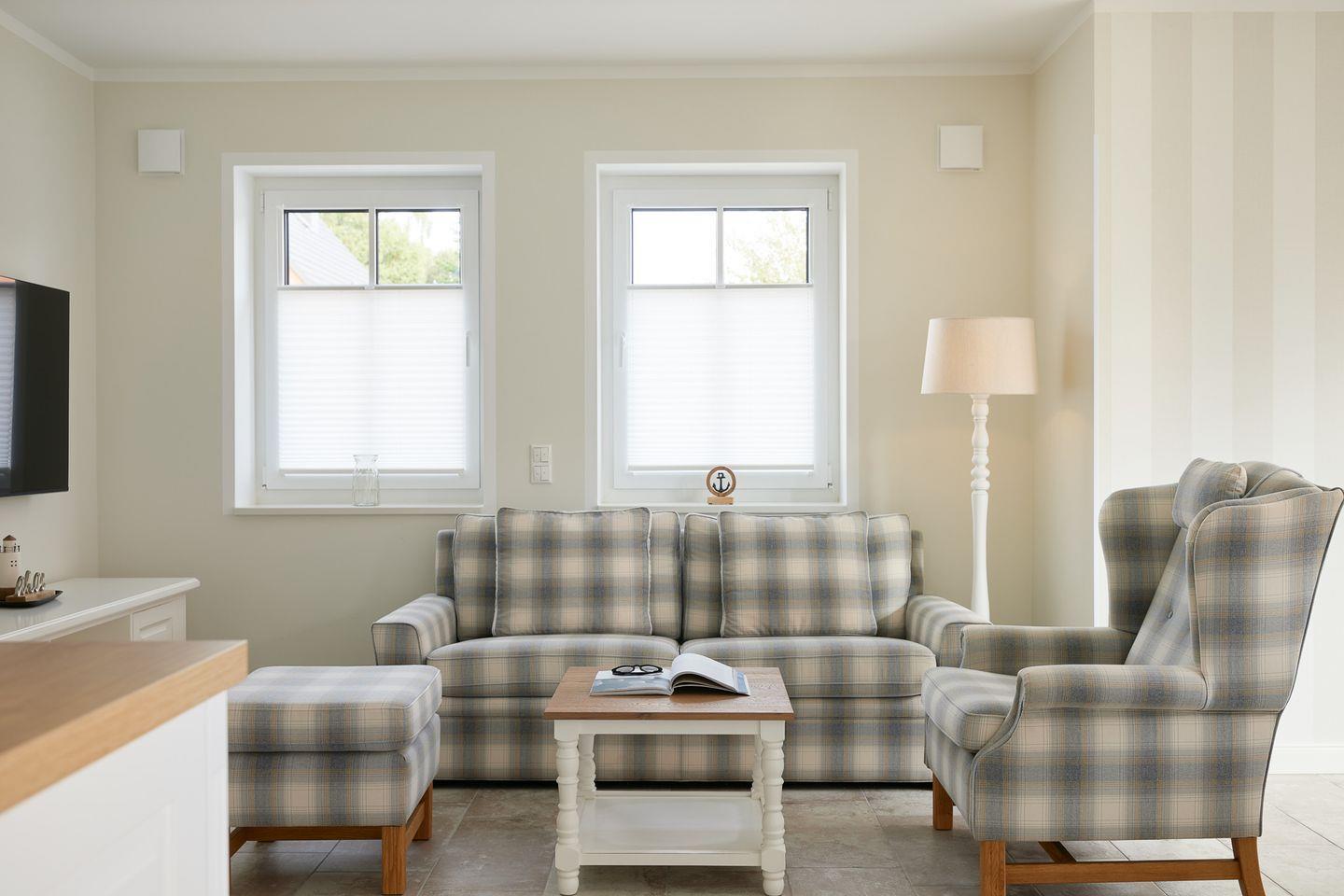 Der offene Wohnbereich besticht durch seine helle Einrichtung und die großzugige Fensterfront, die viel Tageslicht zulässt. Das gemütliche Sofa lädt zum Verweilen ein, während der große Smart-TV für Unterhaltung sorgt.