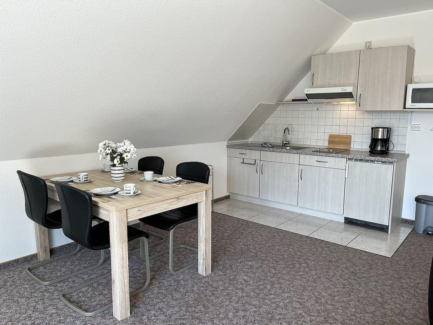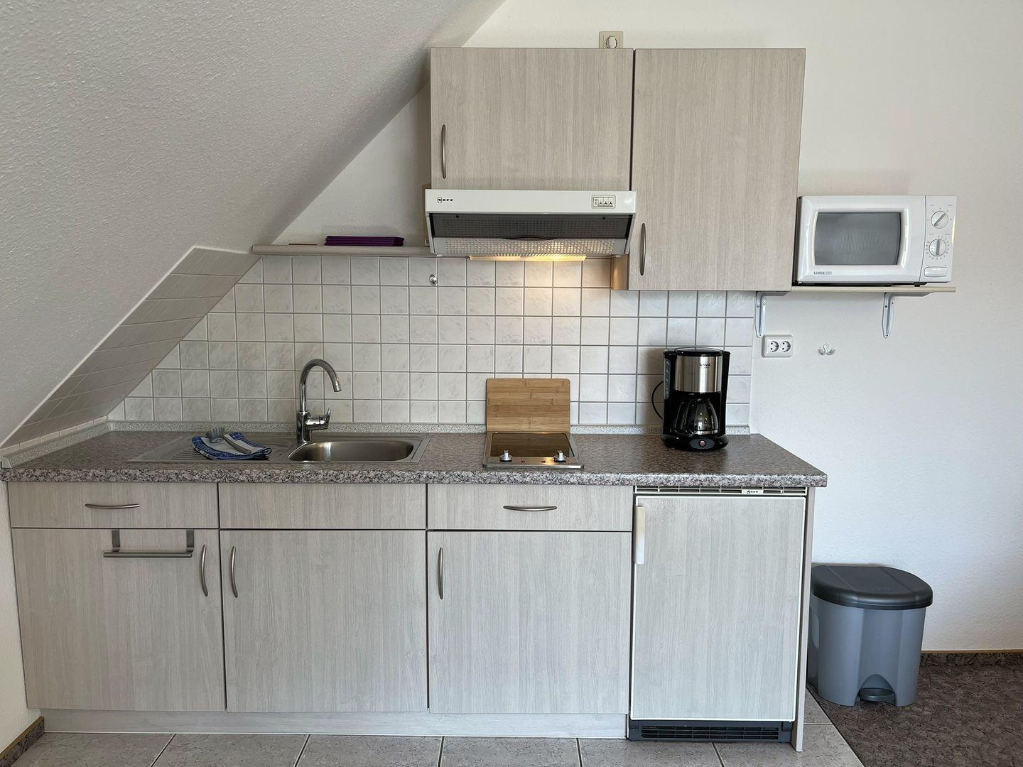 Die offene, kleine Küchezeile im Wohnraum ermöglicht es, sich im Urlaub auch selber zu versorgen. Sie finden dort neben einem 2-Platten-Herd auch eine Mikrowelle, einen Kühlschrank mit Gefrierfach, eine Kaffeemaschine sowie Küchenutensilien, die Ihnen die Zubereitung Ihrer Lieblingsgerichte ermöglichen. Genießen Sie Ihre Mahlzeiten oder einfach nur Ihren Kaffee auf dem einladenden Balkon, für viele schöne Augenblicke im Freien.
