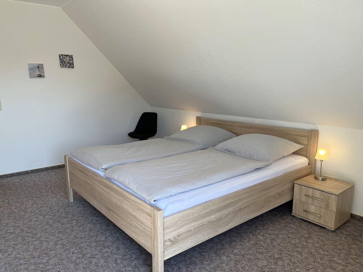 Das separate Schlafzimmer ist mit einem Doppelbett (2 Einzelmatratzen 0,90 x 2m) und einem Kleiderschrank möbliert, hier sind Verdunklungsplissee angebracht. Für die kleinsten Gäste kann hier auch ein Babyreisebett aufgestellt werden, dass sie mitbringen oder bei uns kostenpflichtig dazu buchen können.