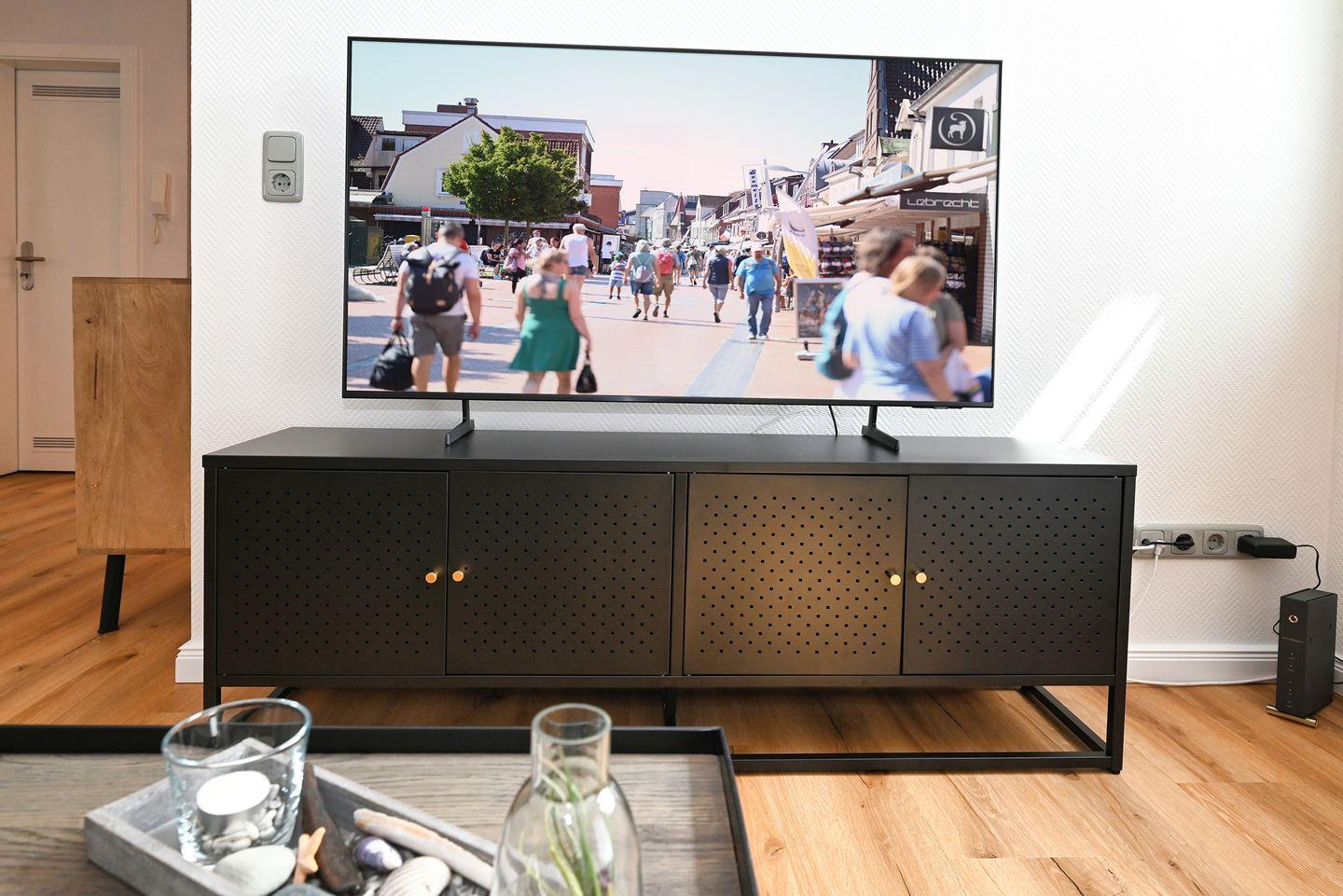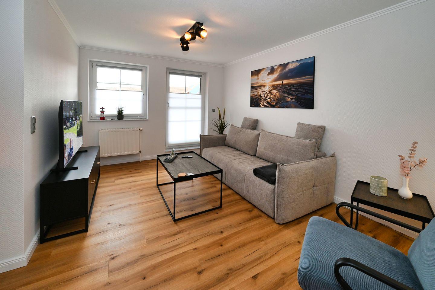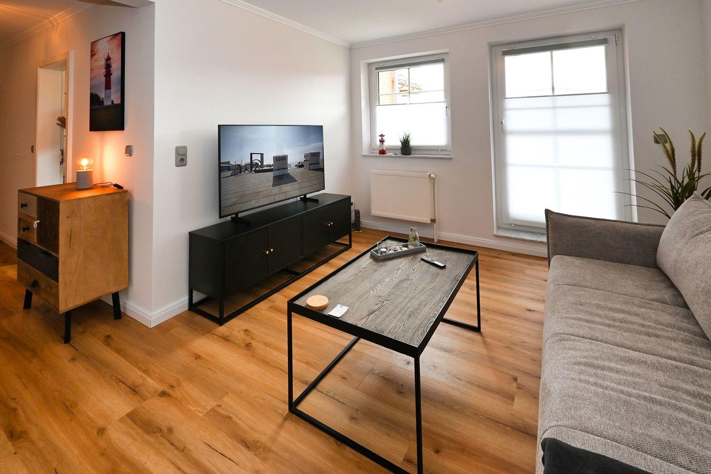 Die Unterkunft überzeugt mit ihrem modernen und gemütlichen Ambiente. Im 1. Stock gelegen, empfängt Sie ein einladender Wohnbereich, ausgestattet mit Sofa, Sessel und einem Smart-TV. Der offene Wohnbereich lädt zu gemütlichen Spieleabenden oder spannende Stunden vor dem Fernseher ein. Die Küche ist vollständig ausgestattet, sodass Sie auch im Urlaub nichts vermissen müssen. Neben einem Herd mit Ceranfeld, einem Kühlschrank und praktischen Küchenutensilien finden Sie hier auch einen Wasserkocher, Toaster und eine Kaffeemaschine – ideal, um in aller Ruhe frühstücken zu können.