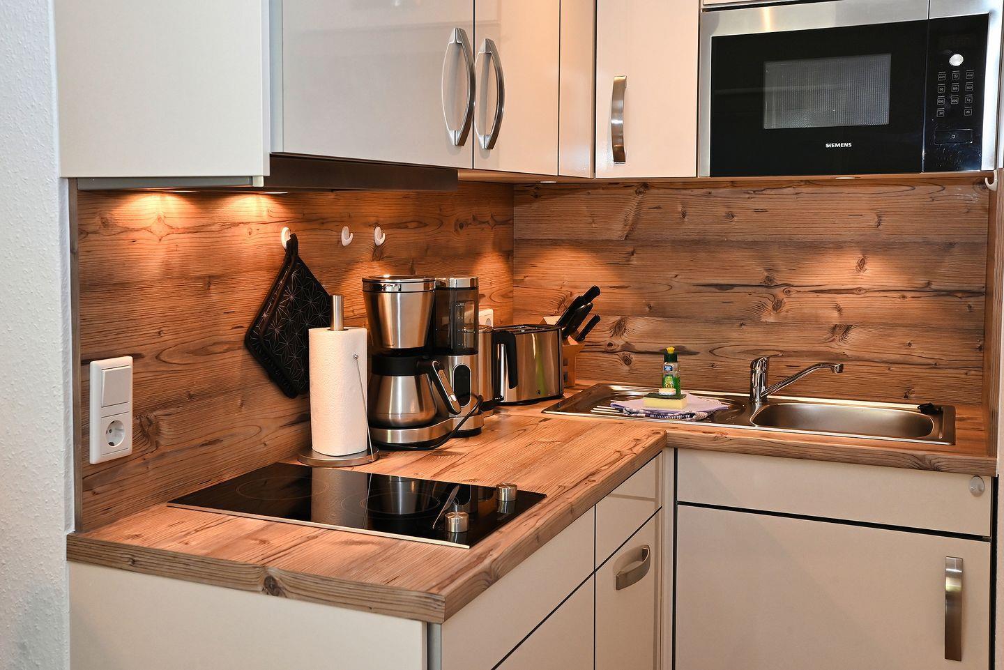 Die Wohnung besteht aus insgesamt zwei Zimmern, darunter ein komfortables Schlafzimmer mit einem angenehmen Boxspringbett, einem einladenden Wohnzimmer mit Sofaecke und einem Essbereich, der zum genussvollen Verweilen einlädt. Ein Schlafsofa im Wohnzimmer bietet eine weitere Schlafmöglichkeit, die besonders für Kinder geeignet ist. Die offene Küche ist mit modernen Geräten ausgestattet, darunter ein Cerankochfeld, ein Backofen sowie eine Mikrowelle. Hier finden Sie alles, was Sie benötigen, um köstliche Mahlzeiten zuzubereiten und die Zusammenarbeit beim Kochen zu genießen.