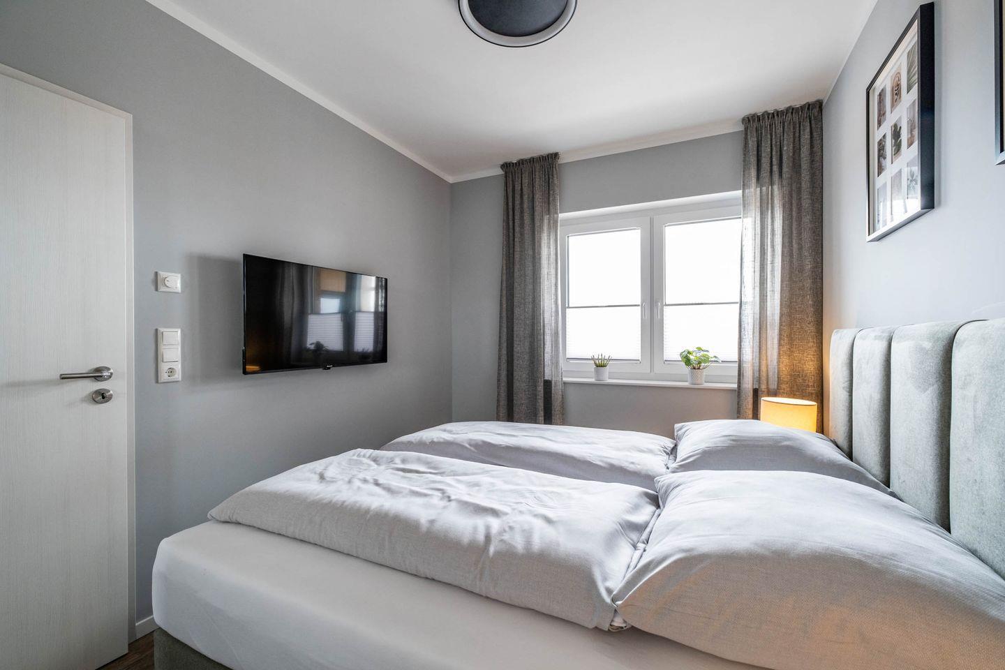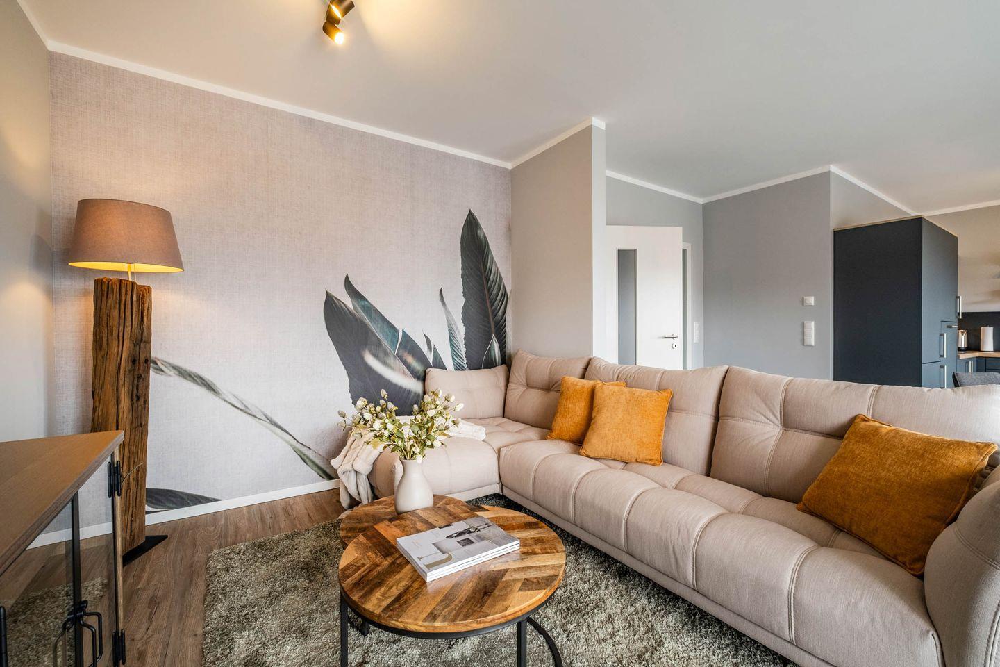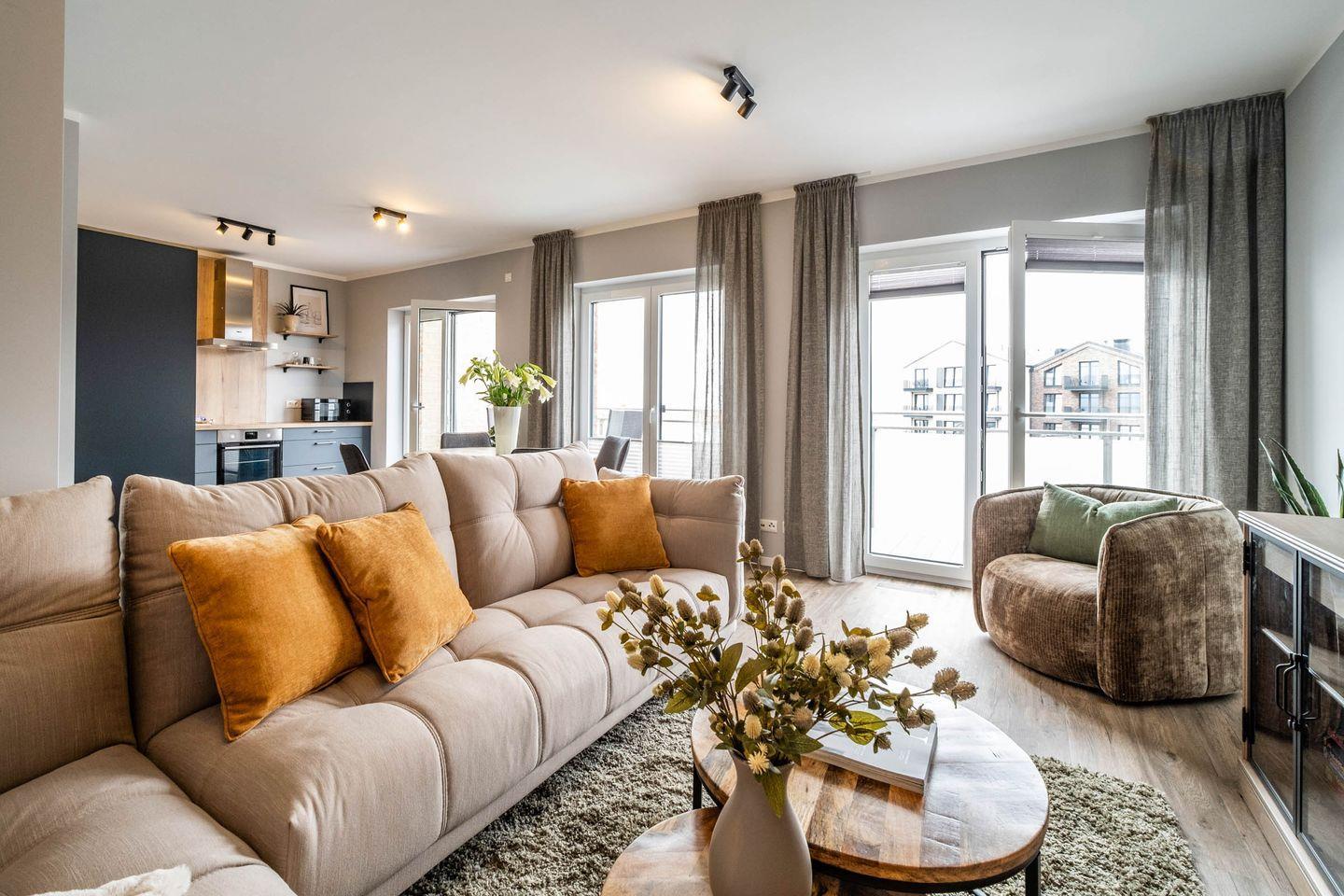 Bei der Ausstattung des Penthouse Apartments wurde an alles gedacht. In zwei stilvoll eingerichteten Schlafzimmern mit hochwertigem Vinylboden finden Sie ruhigen Schlaf und erholsame Nächte. Das großzügige Wohnzimmer verfügt über eine gemütliche Sofaecke und einen Essbereich, ideal für zusammen verbrachte Mahlzeiten. Die offene Küche ist mit modernen Geräten wie einem Ceranherd, einem Backofen, einer Mikrowelle und einer Spülmaschine ausgestattet. Auch Geschirr und Besteck, sowie Küchenutensilien sind in ausreichender Zahl vorhanden, damit Sie sich wie zu Hause fühlen können. WLAN ist im gesamten Apartment kostenfrei verfügbar, sodass Sie auch während Ihres Urlaubs die Verbindung zur Außenwelt aufrechterhalten können.