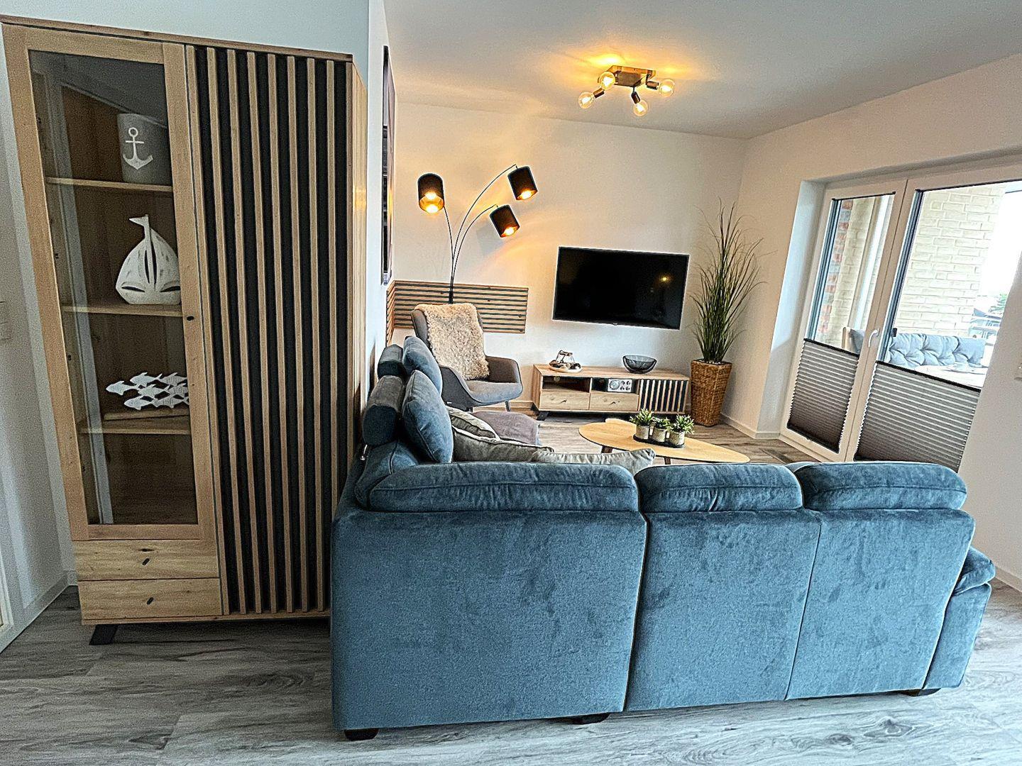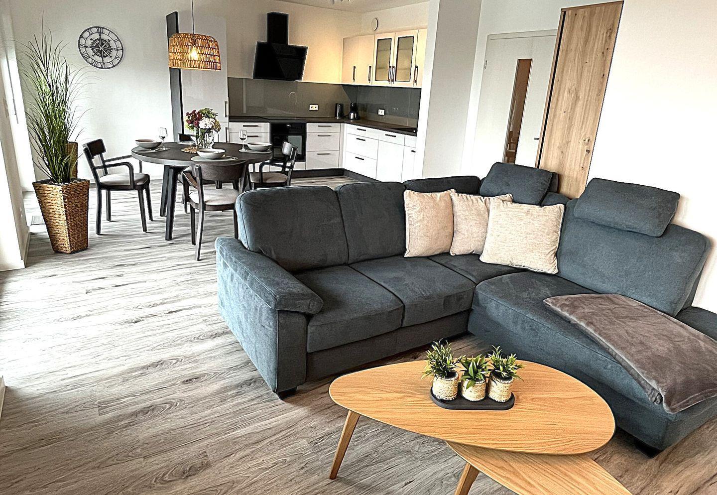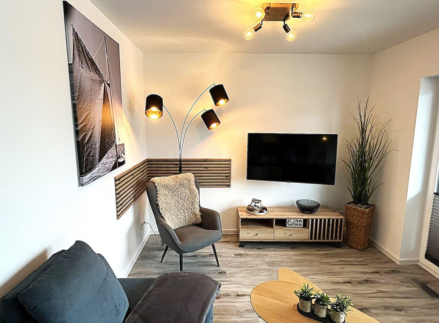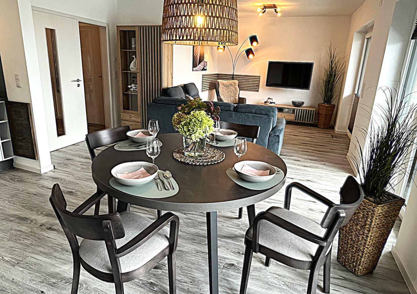 Der offene Wohn- und Essbereich überzeugt mit durchdachter Raumaufteilung und hochwertigem Mobiliar. Es stehen eine gemütliche Sofaecke, Sessel, Esstisch sowie eine Kommode bereit. Für Unterhaltung sorgt ein großer Fernseher ( Smart TV) und Bluetooth- fähiges Radio. Ein kostenloses, schnelles WLAN (Glasfaser) steht zur Verfügung – ideal für Streaming, Homeoffice oder den Kontakt nach Hause.