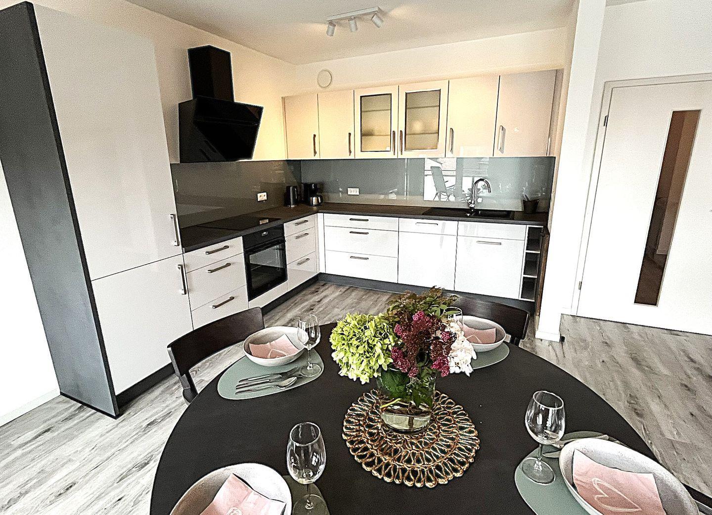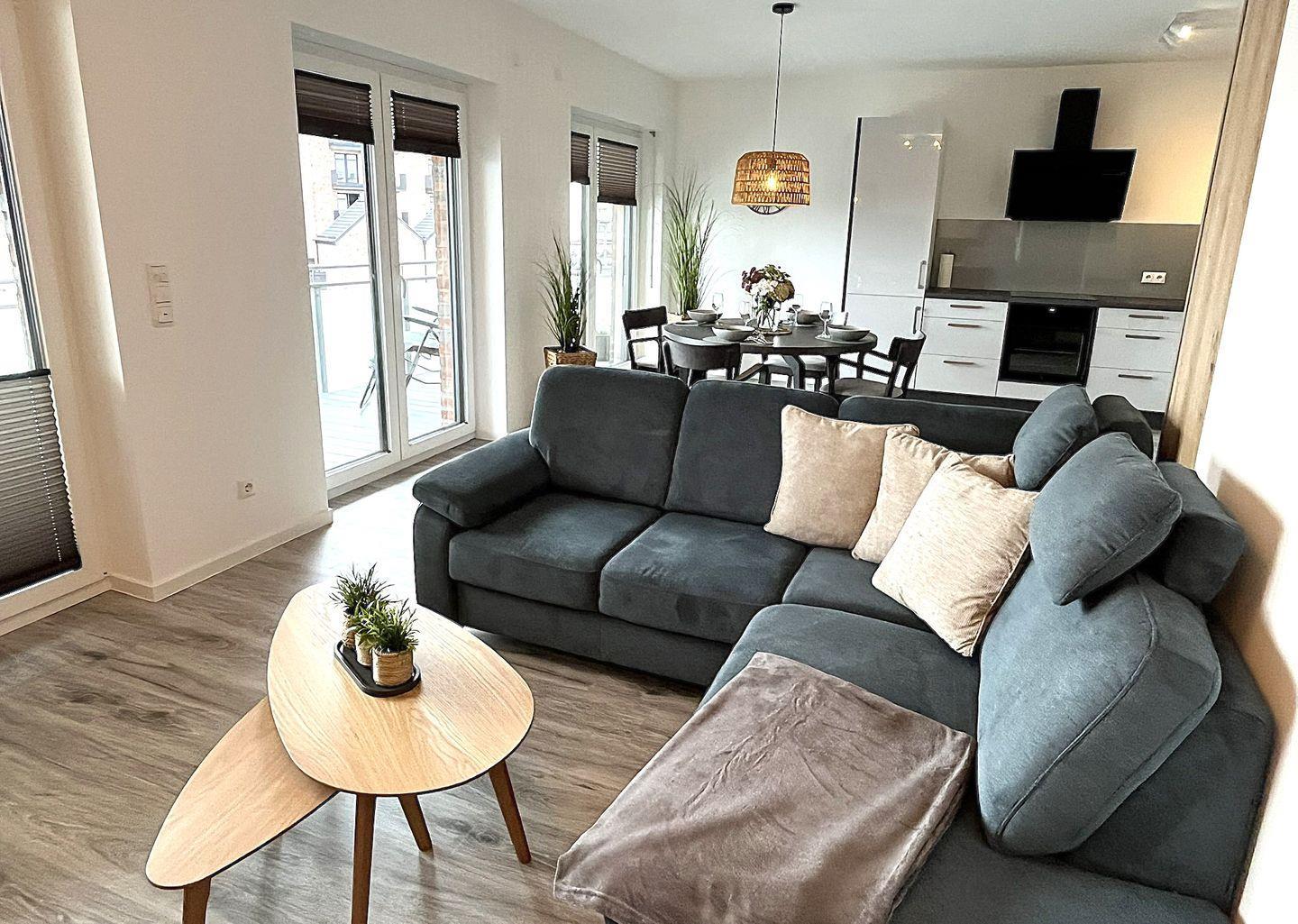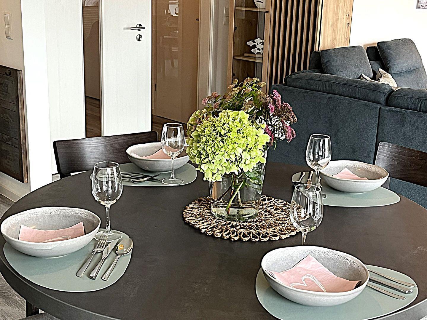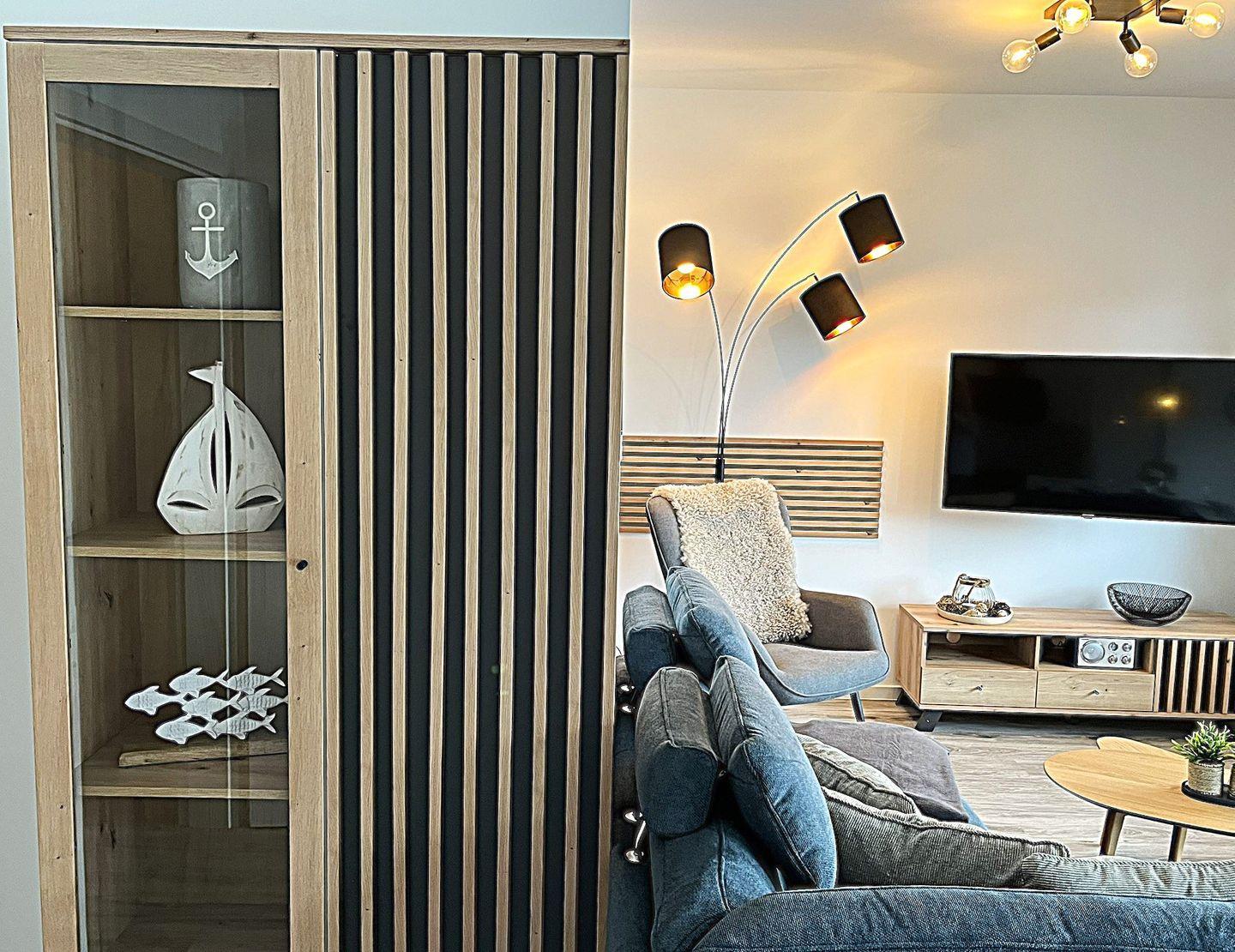 Der offene Wohn- und Essbereich überzeugt mit durchdachter Raumaufteilung und hochwertigem Mobiliar. Es stehen eine gemütliche Sofaecke, Sessel, Esstisch sowie eine Kommode bereit. Für Unterhaltung sorgt ein großer Fernseher ( Smart TV) und Bluetooth- fähiges Radio. Ein kostenloses, schnelles WLAN (Glasfaser) steht zur Verfügung – ideal für Streaming, Homeoffice oder den Kontakt nach Hause.