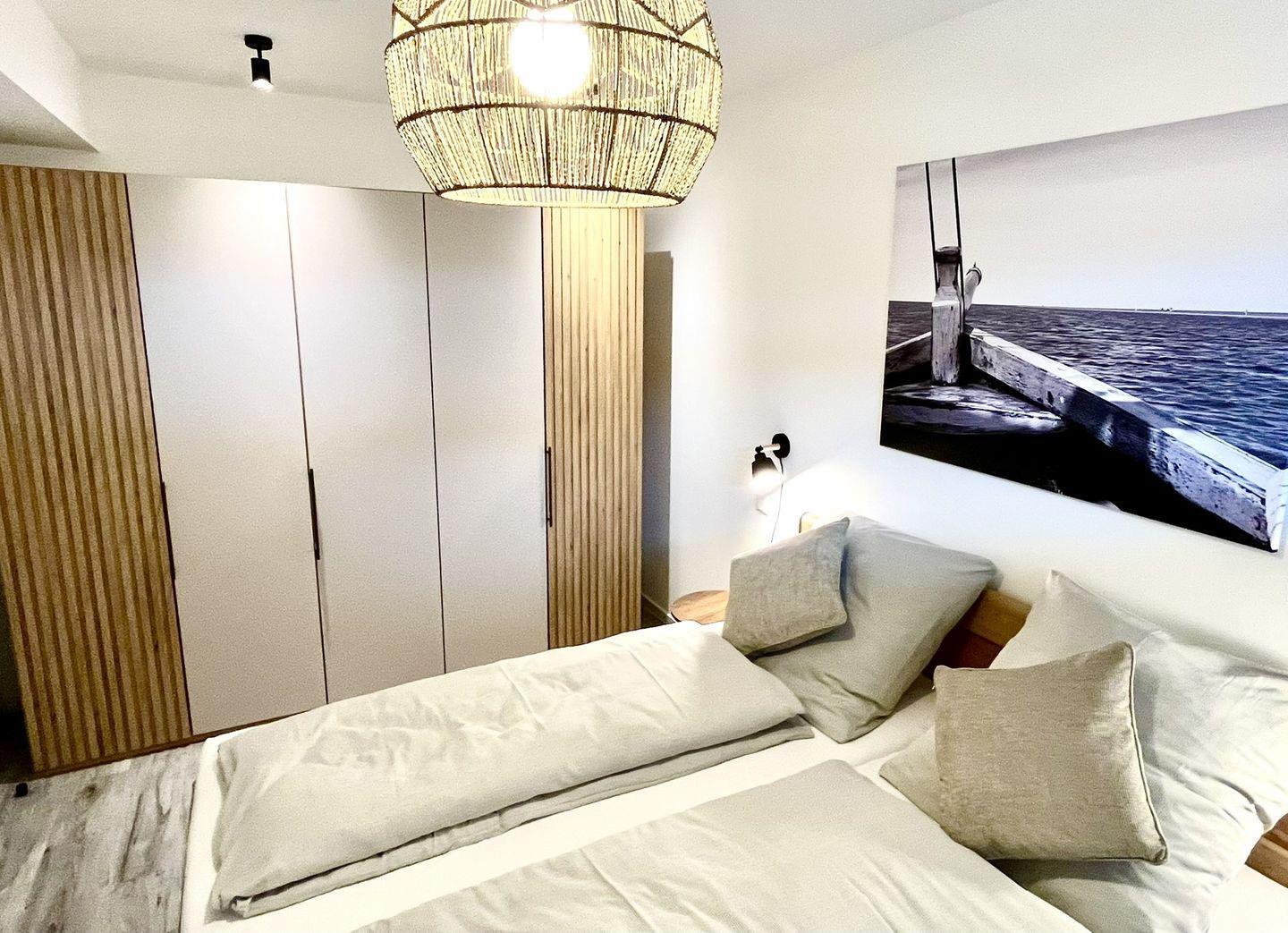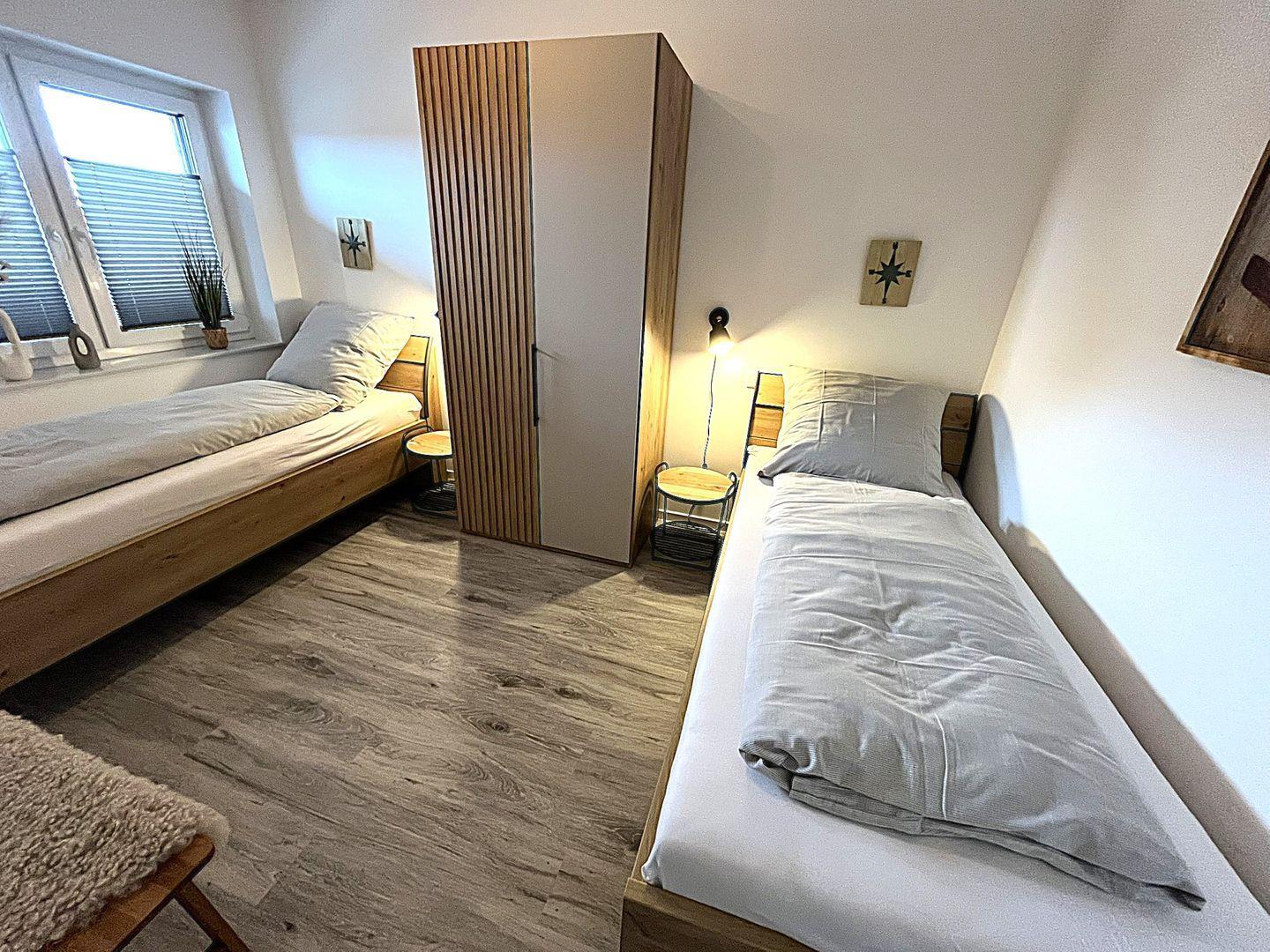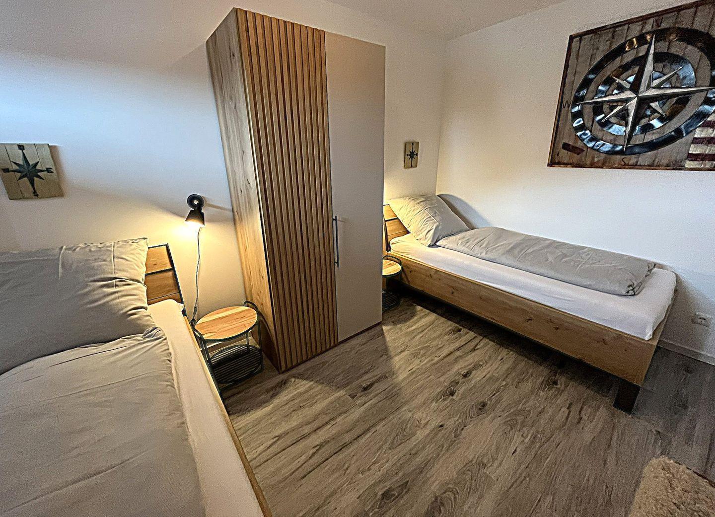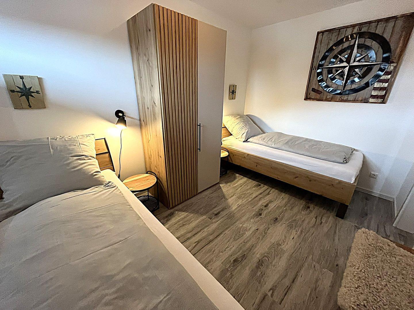 Die beiden Schlafzimmer bieten Platz für 4 Personen, das erste Schlafzimmer ist mit einem Doppelbett ( 2 Einzelmatratzen 90x200 cm), das zweite Schlafzimmer mit 2 Einzelbetten (90x 200 cm) möbliert. In beiden Schlafzimmern befinden sich TV- Geräte ( Keine Smart TV) und Kleiderschränke.