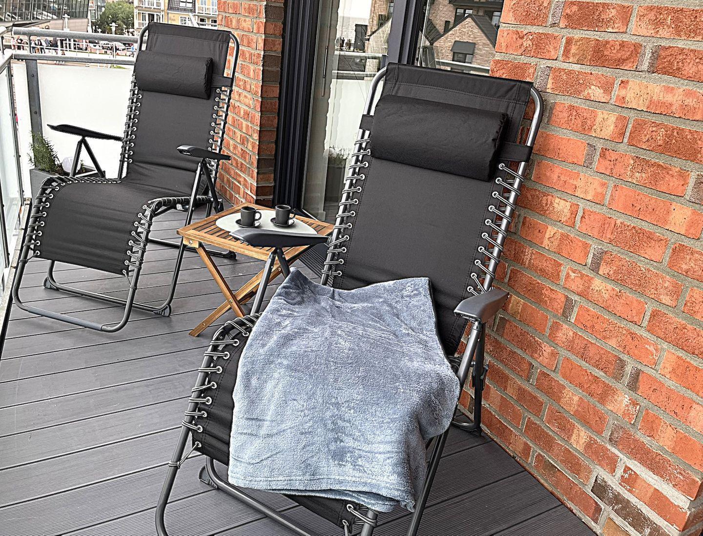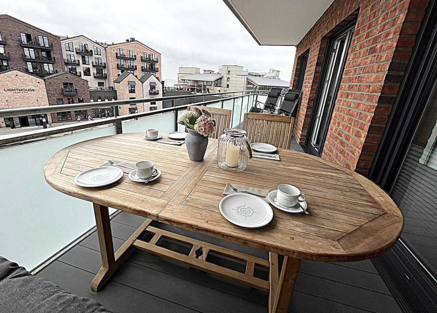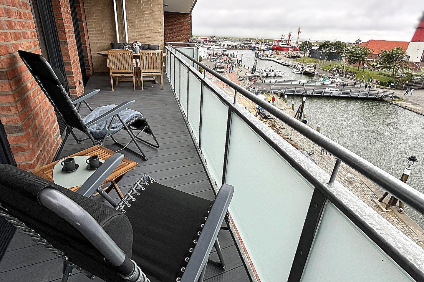 Das absolute Highlight der Wohnung ist der überdachte Balkon, der mit Holzmöbeln und 2 Relaxstühlen zum entspannen einlädt. Von hier haben Sie den Blick auf den bekannten Büsumer Hafen und die Nordsee.