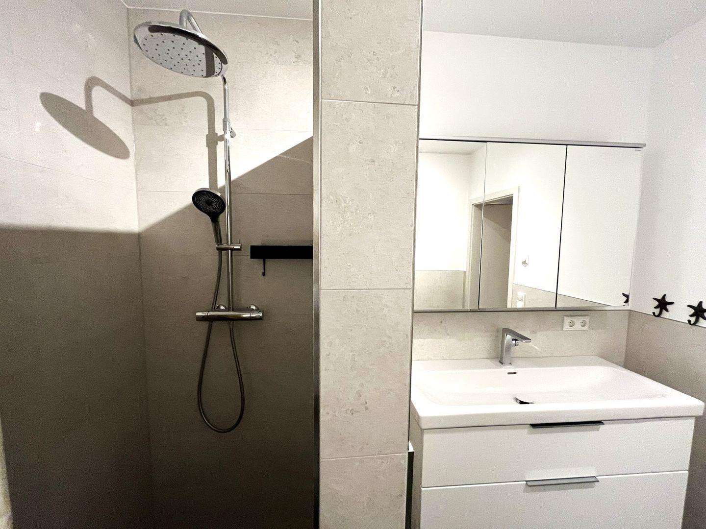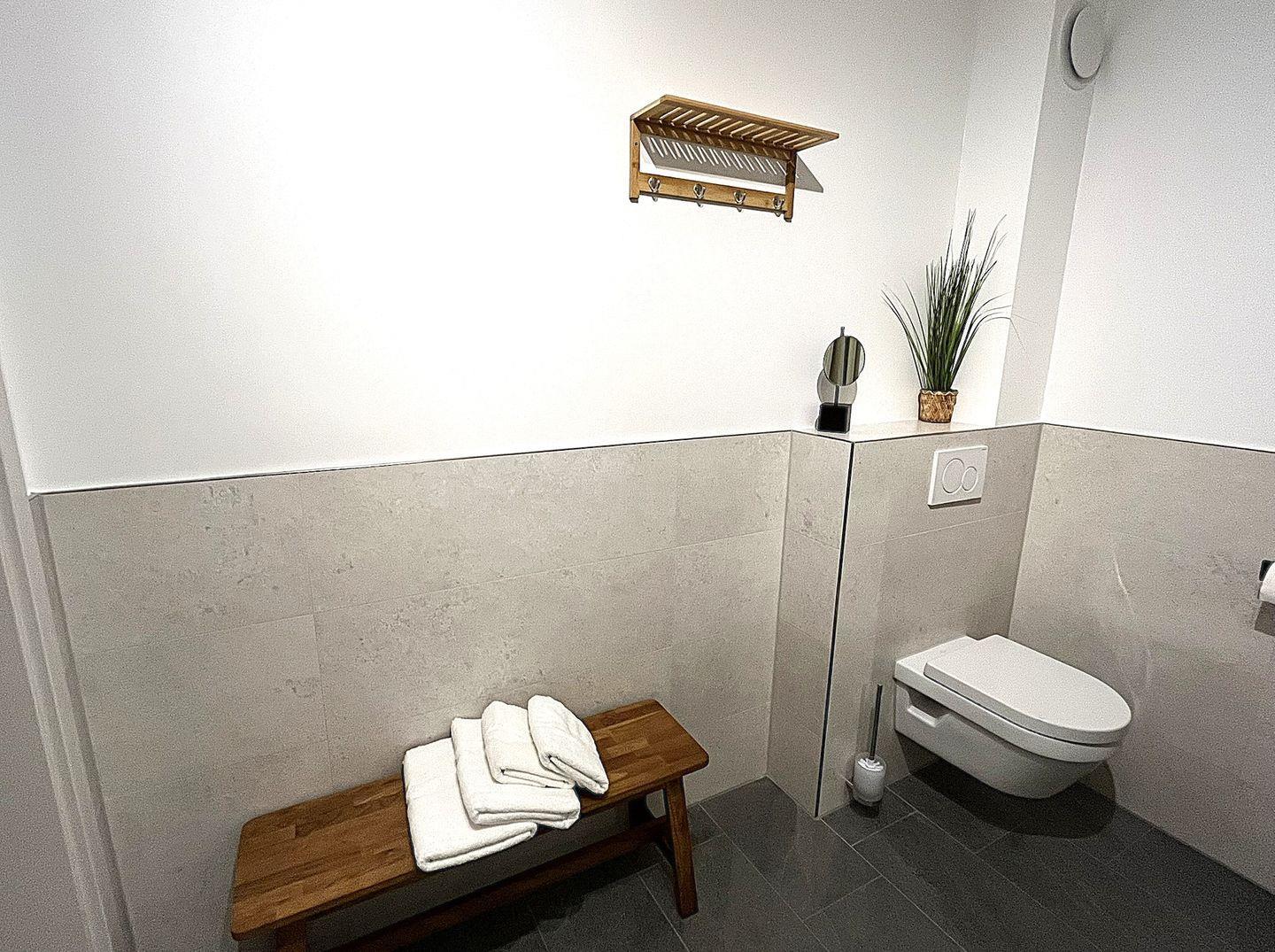Besonderes Wohlbefinden bieten die beiden modernen Badezimmer, die mit bodengleichen Duschen, WC, Spiegeln, Kosmetikspiegel und Haartrockner versehen sind. Der Sichtschutz (Plissees und Außenjalousien) an allen Fenstern garantiert Privatsphäre.