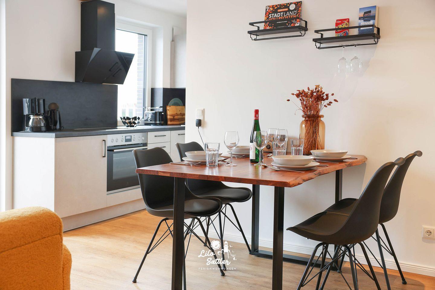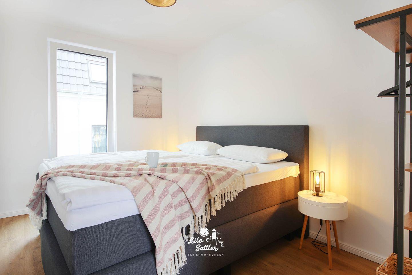 Top ausgestattet nahe Deich & Hafen: Deichstuben Whg. 2 bietet ca. 70 m² mit Balkon, zwei separaten Schlafzimmern (Boxspring 180×200, Smart-TV), hellem Wohn-/Essbereich und voll ausgestatteter Küche (u. a. Geschirrspüler). Modernes Bad mit bodengleicher Dusche. Parkplatz, kostenlose Wallbox, E-Bike-Schuppen, gemeinsamer Waschtrockner. Alles fußläufig.