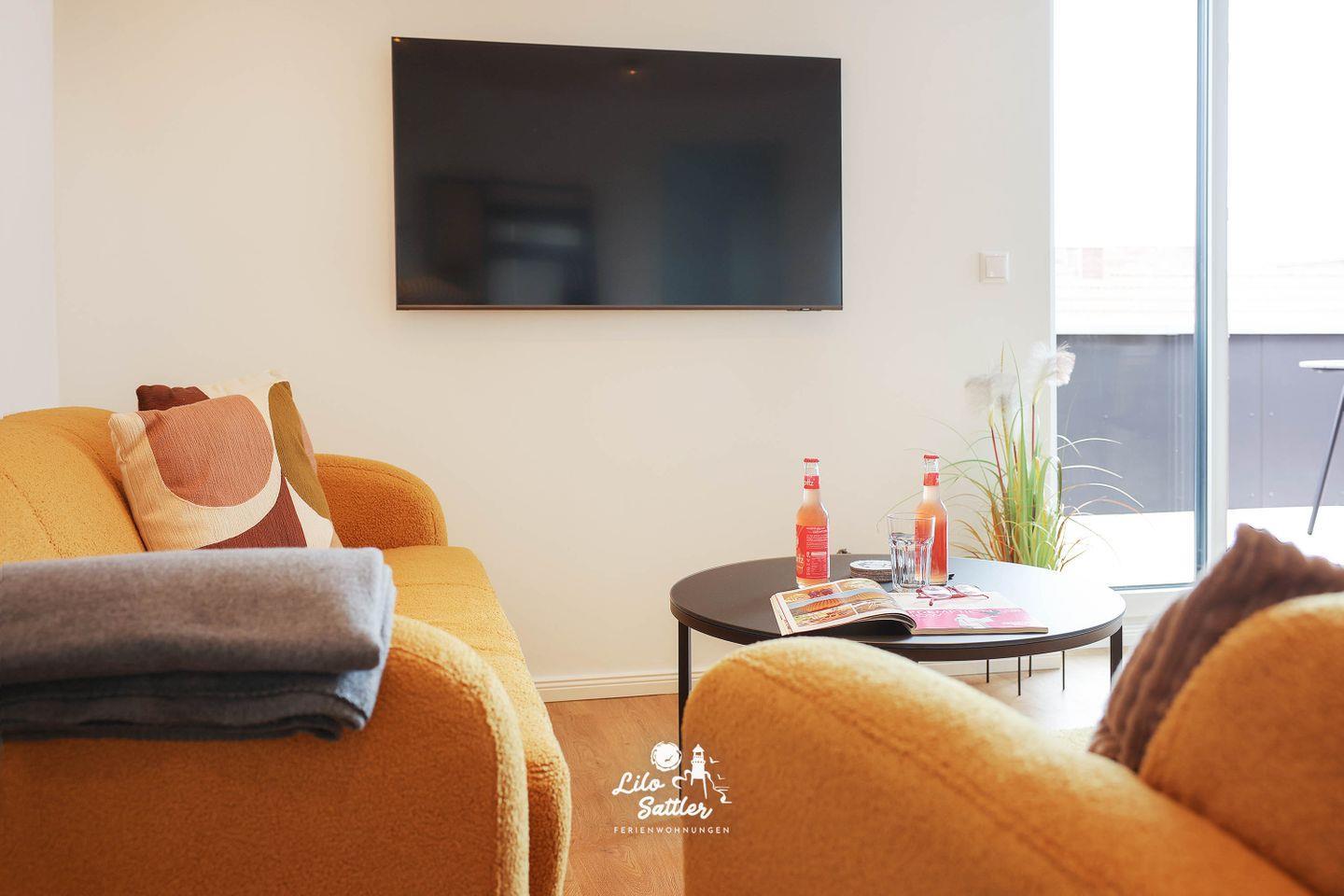 2 gemütliche Sofas, Smart TV, Essplatz mit 4 Stühlen, DAB+ Radio, Zugang zum Balkon mit Balkonmöbeln