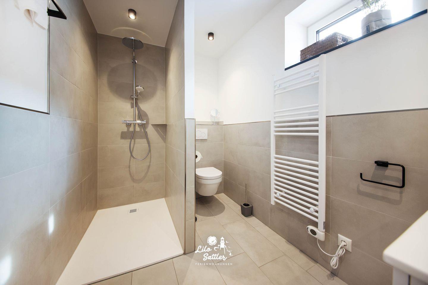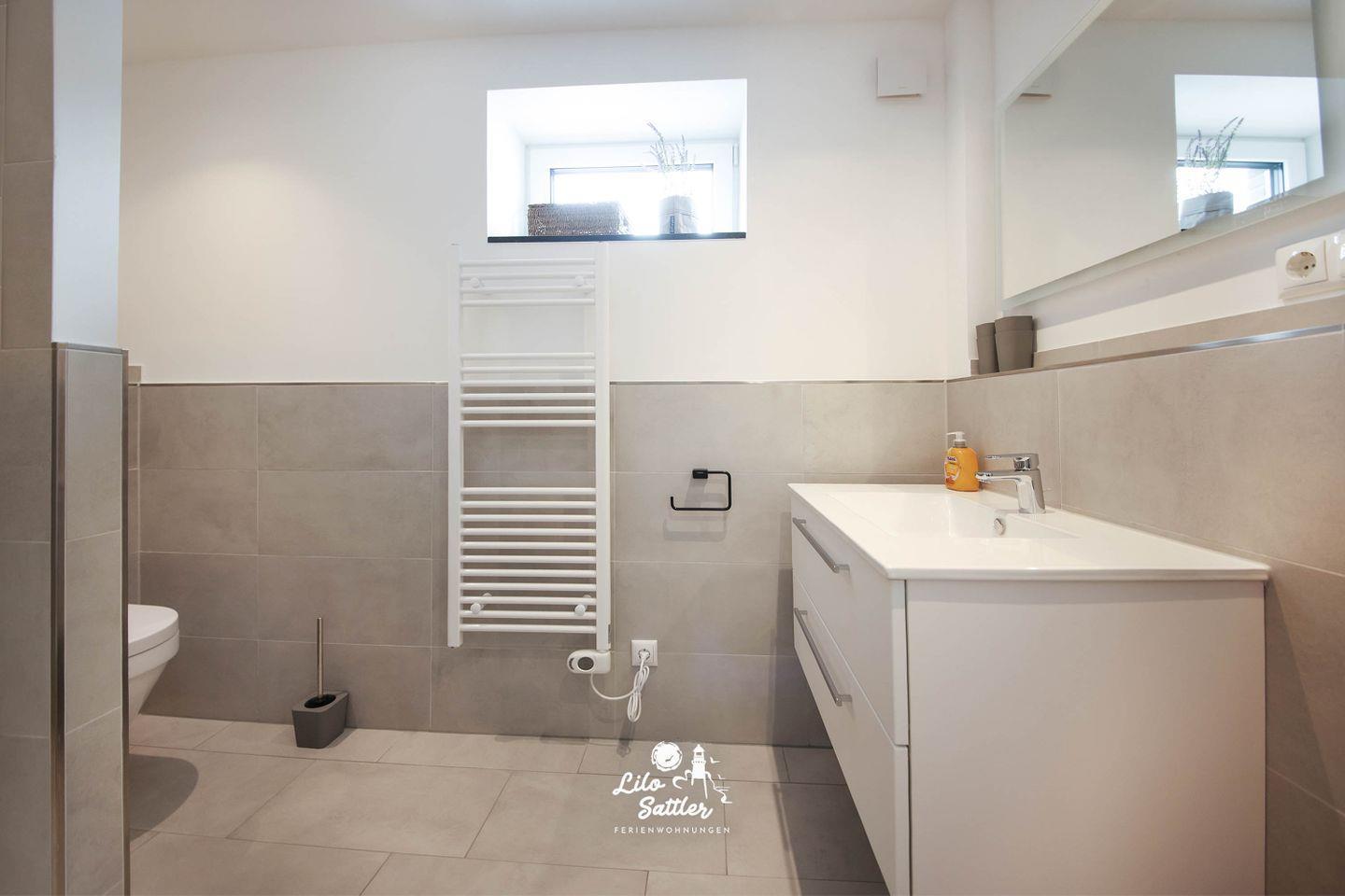 Das moderne Bad überzeugt mit bodengleicher Dusche, WC, Waschtisch, Spiegel und Föhn. Zur weiteren Ausstattung zählen Garderobe, Wohnraumlüftung, Türsprechanlage, Fahrradschuppen mit E-Bike-Ladestation, Parkplatz am Haus sowie Wallbox (kostenfrei). Für längere Aufenthalte stehen gemeinschaftlicher Waschtrockner, Bügelbrett und Bügeleisen bereit; Wäschepakete sind optional buchbar.