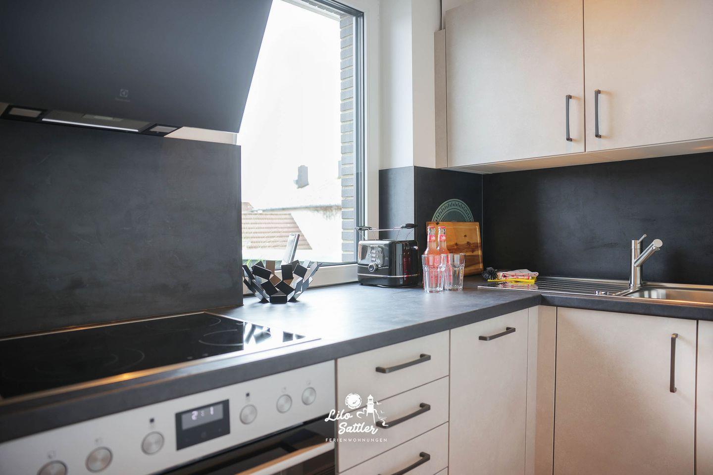 Herd mit Ceranfeld und Backofen, Kühlschrank mit Gefrierfach, Geschirrspüler, Wasserkocher, Toaster, Eierkocher, Filter-Kaffeemaschine