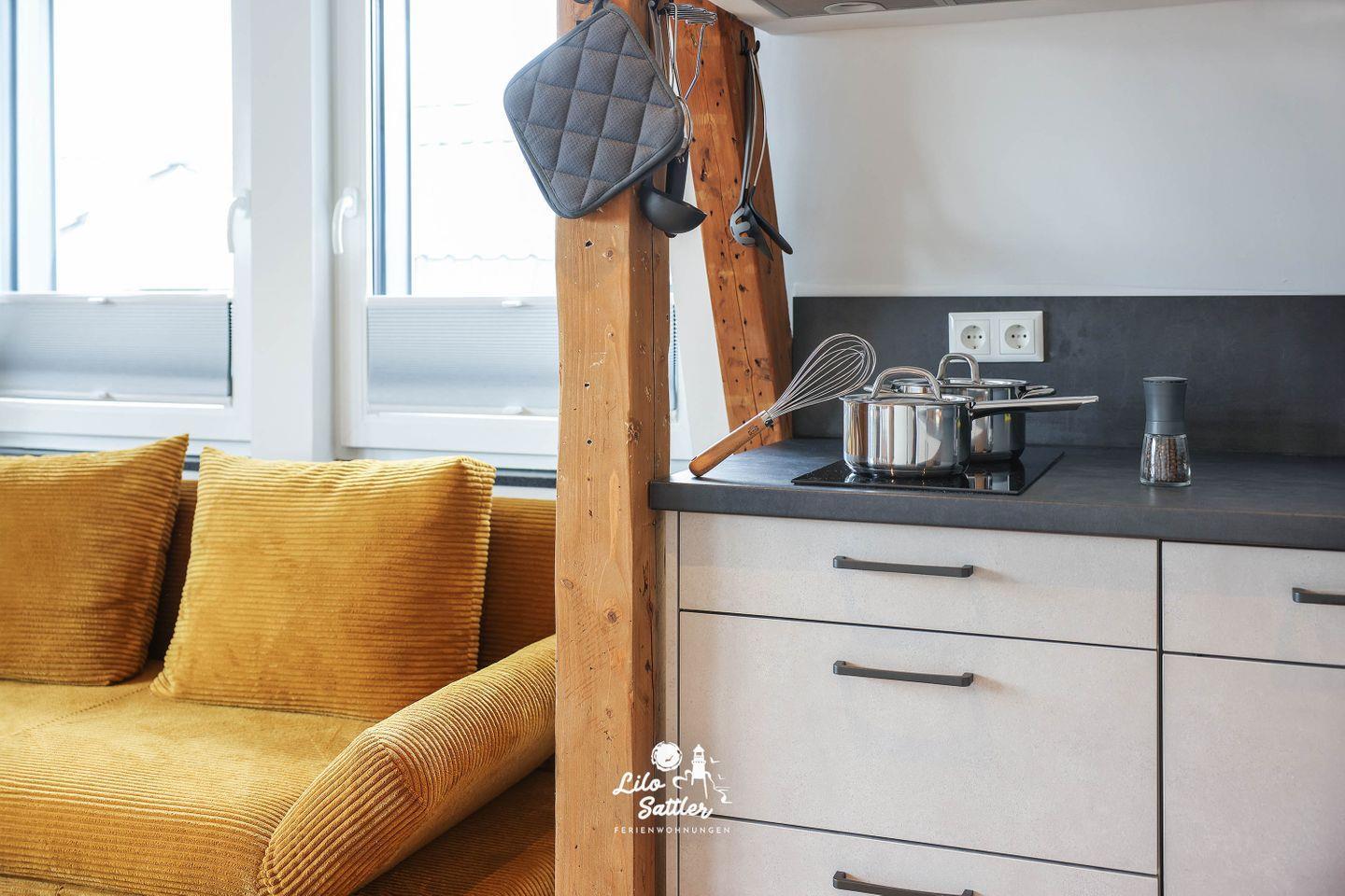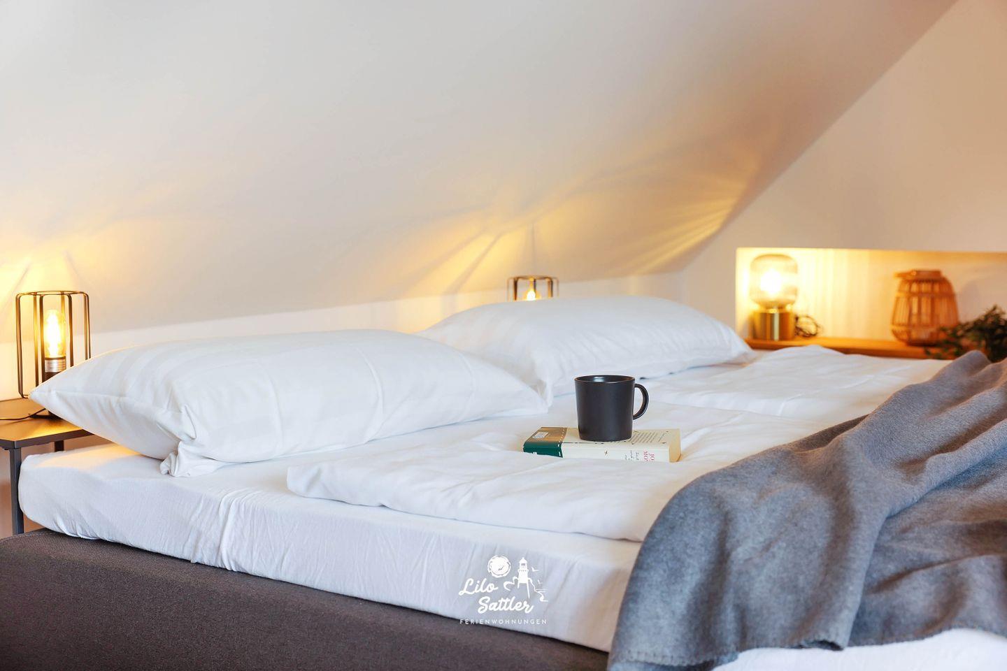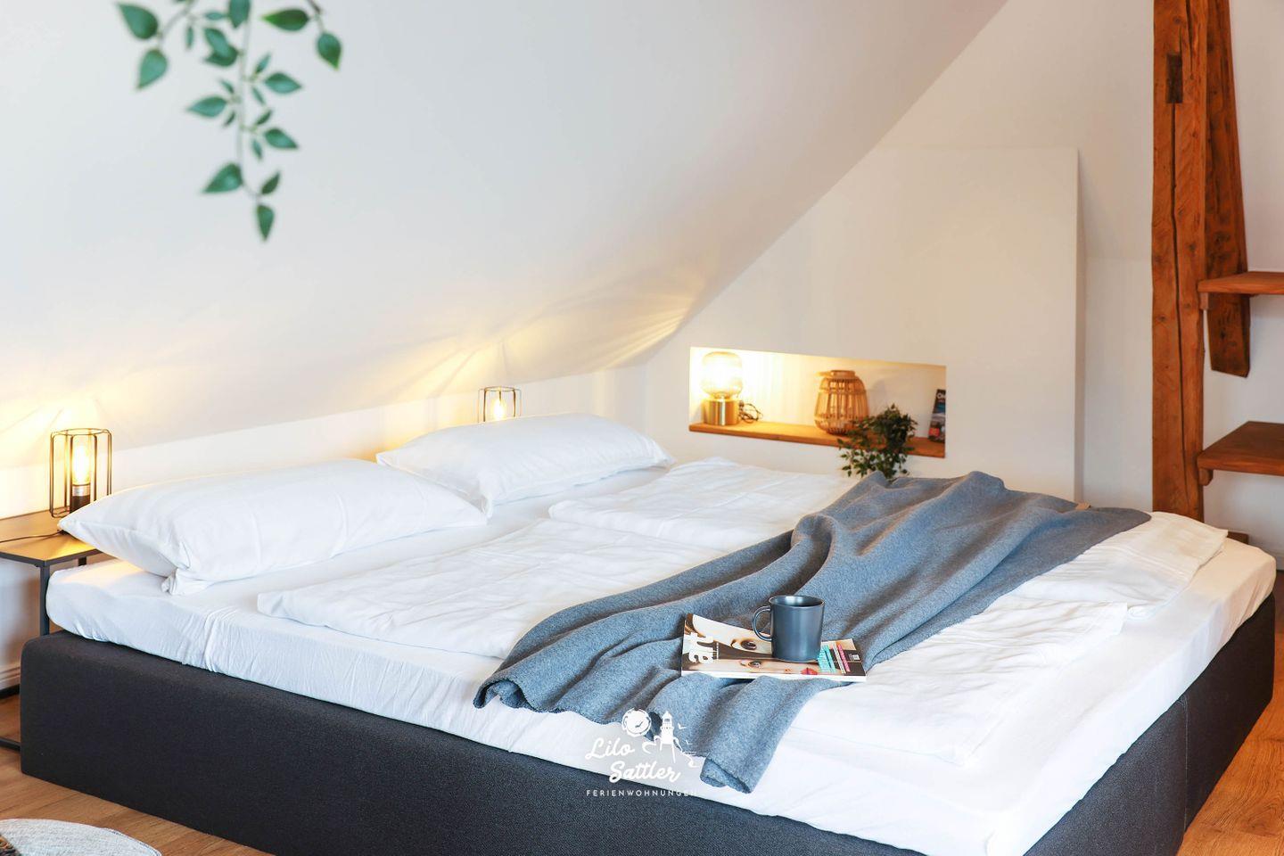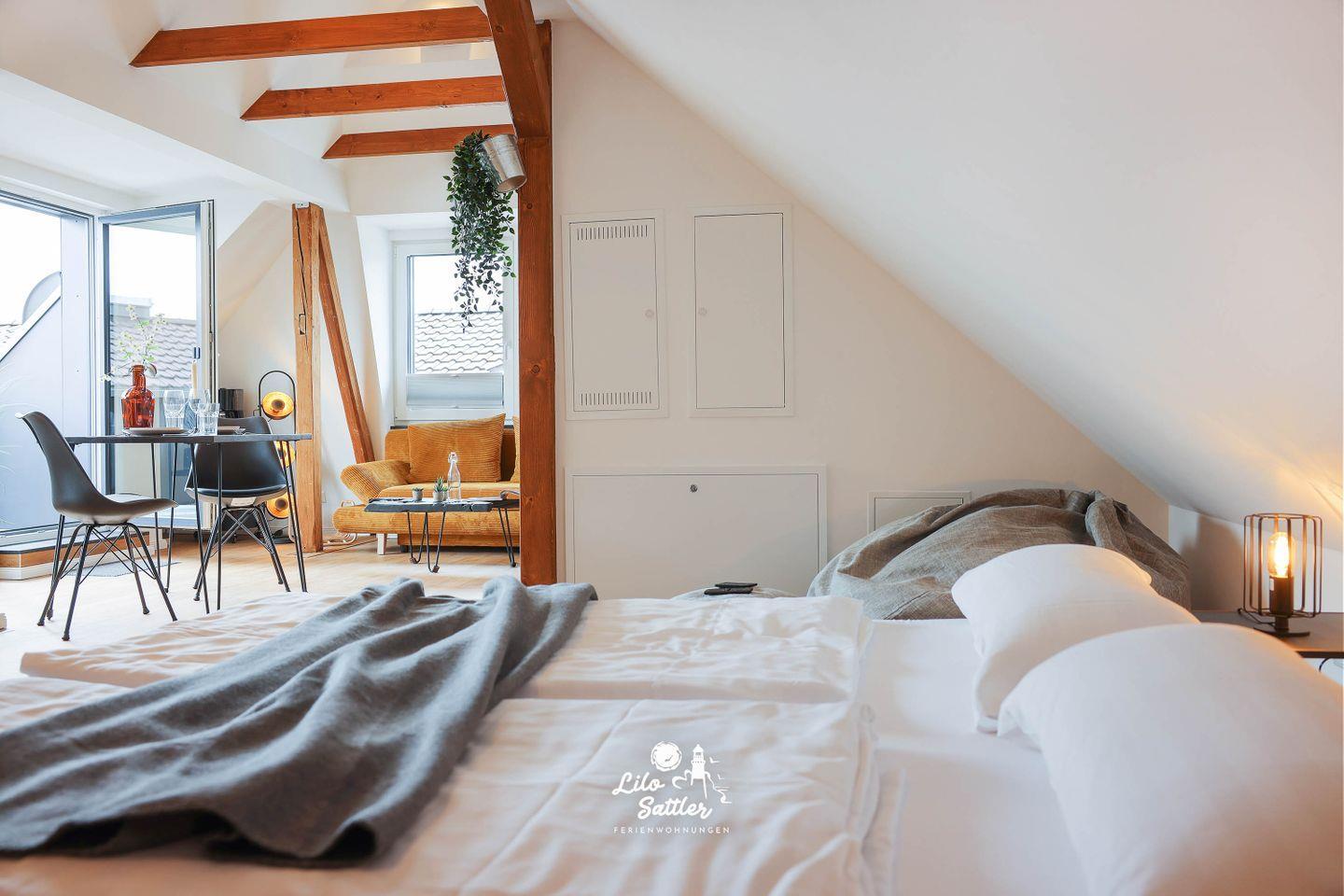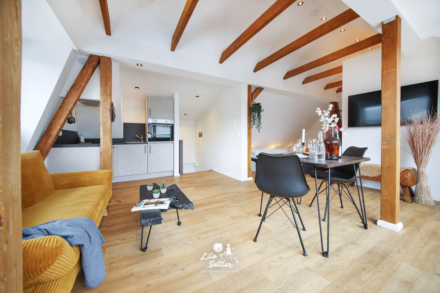 Willkommen in Ihrer stilvollen Ferienwohnung mit urbanem Loft-Flair und gemütlichem Nordsee-Charme. Der offene Wohn-/Schlafraum bietet ein Doppelbett (ca. 180×200 cm) mit getrenntem Topper, offenen Kleiderschrank, Sofa mit Schlaffunktion, Smart-TV am drehbaren Arm, DAB+ Radio sowie einen Esstisch. Durch die Tür treten Sie auf den Balkon – ausgestattet mit modernen Retro-Sesseln und Tisch für den ersten Kaffee über den Dächern.