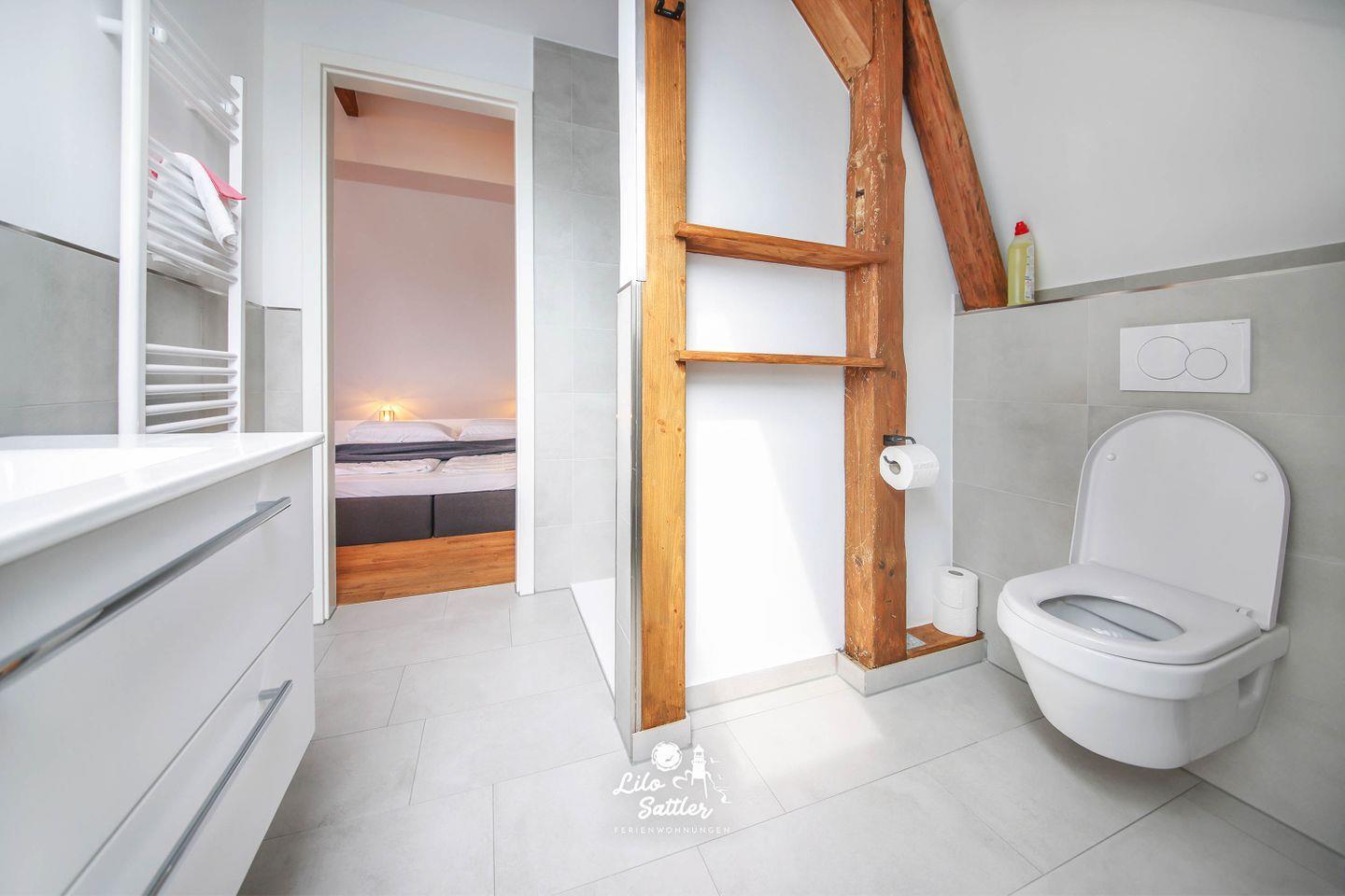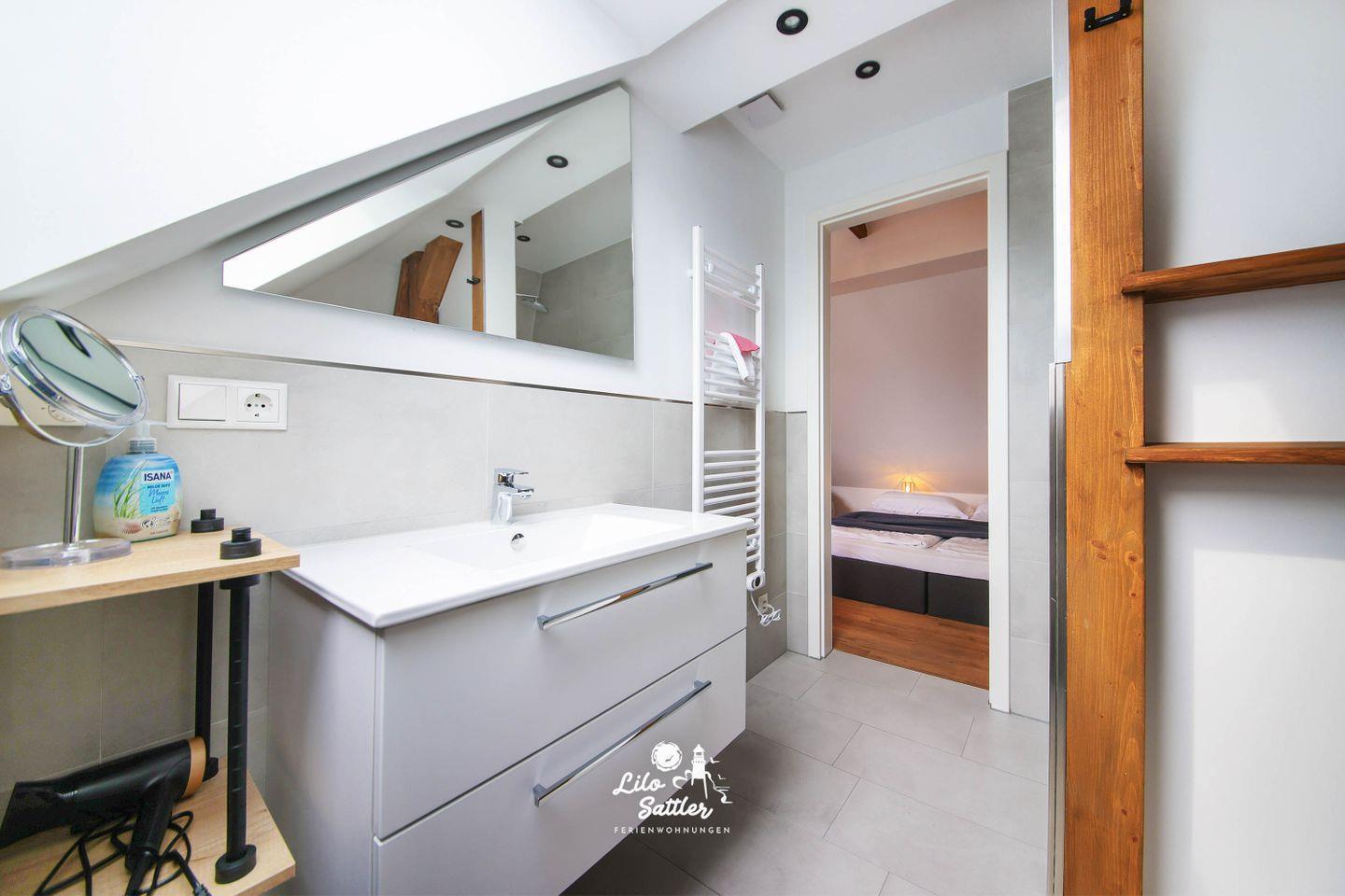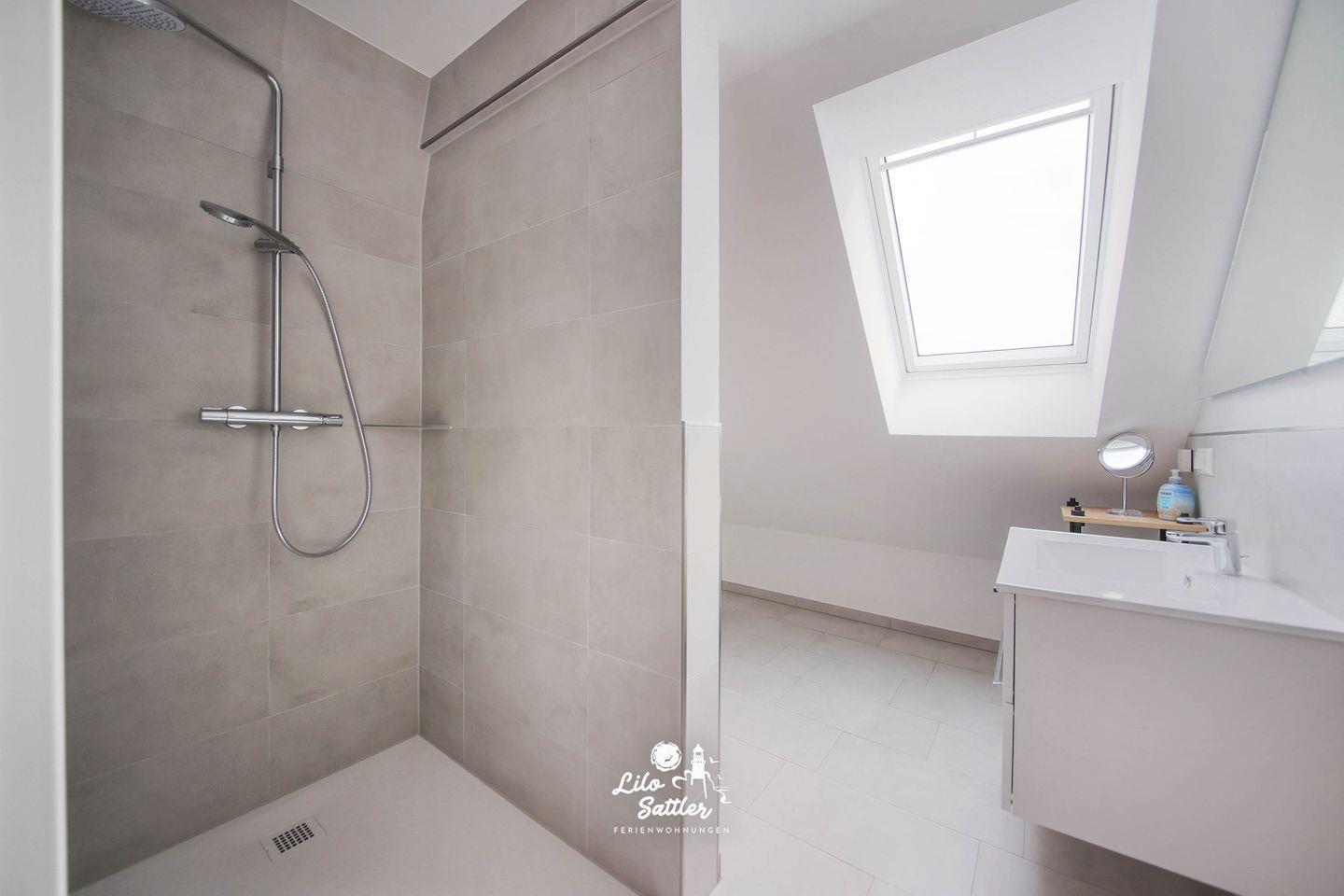offene bodengleiche Dusche, WC, Waschbecken mit Unterschrank, Spiegel, Föhn, Dachfenster