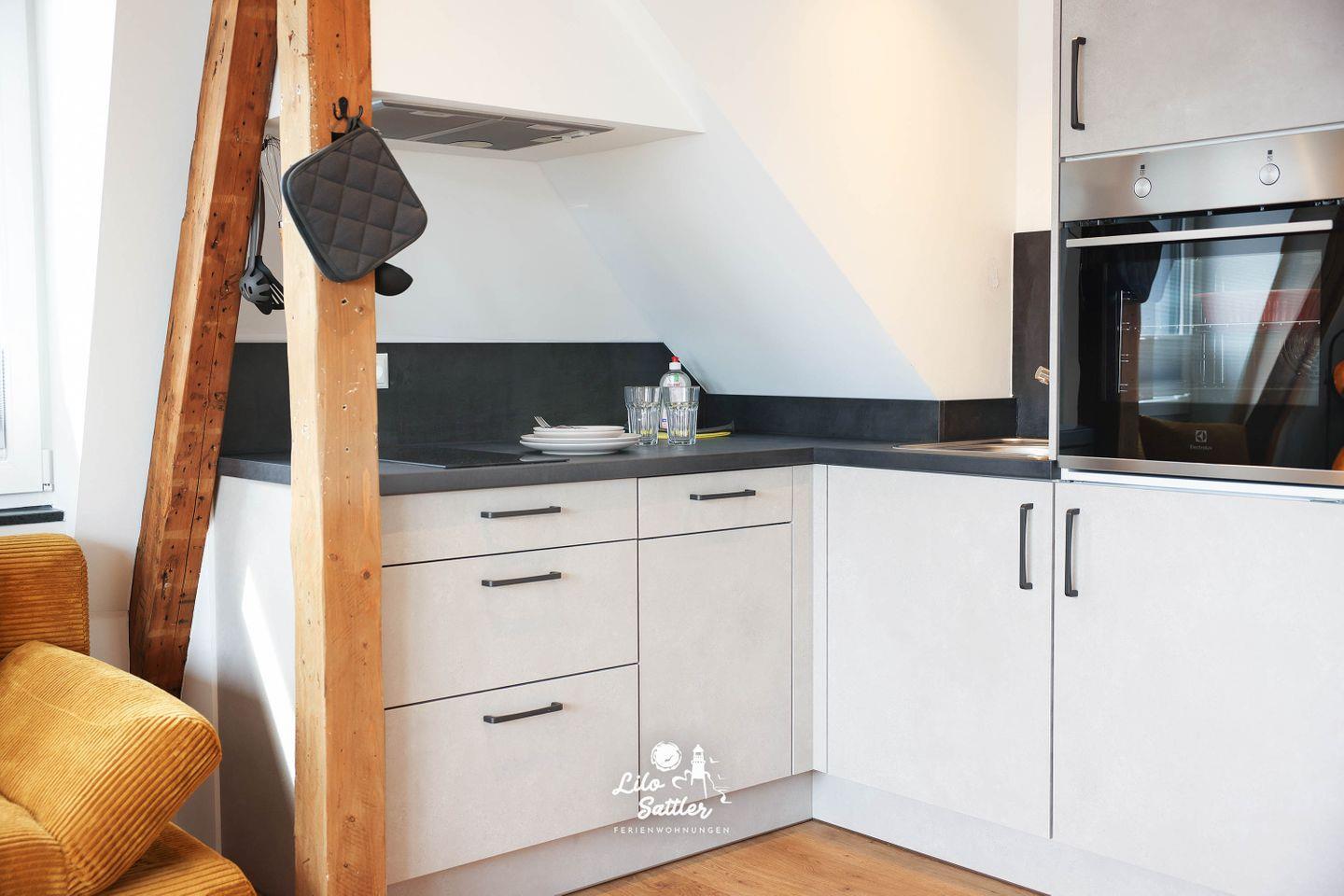 Die Küchenzeile ist smart geplant: 2-Zonen-Ceranfeld, separater Backofen, Kühlschrank mit Gefrierfach, Geschirrspüler, Wasserkocher, Toaster und Filter-Kaffeemaschine – ideal für den kleinen Hunger zwischendurch. Im Bad erwarten Sie eine bodengleiche, offene Dusche, WC, Waschtisch mit Unterschrank, Spiegel, Föhn und Dachfenster.