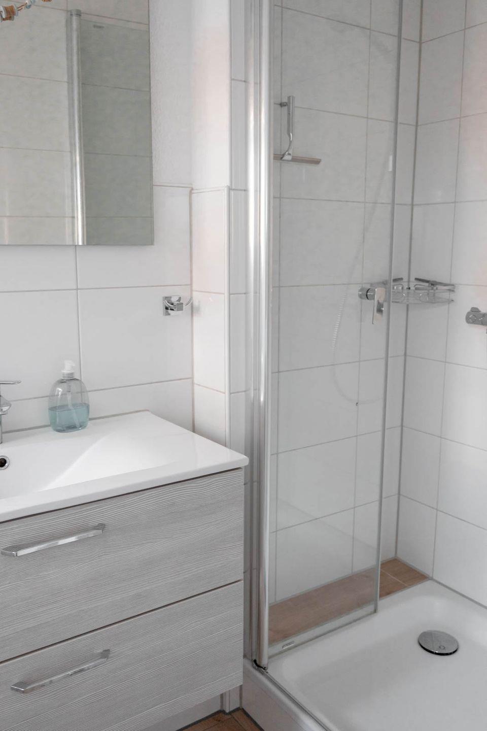 Das Badezimmer präsentiert sich mit einer bodengleichen XL Dusche, WC, Waschbecken, Spiegel und Kosmetikspiegel sowie einem Haartrockner.