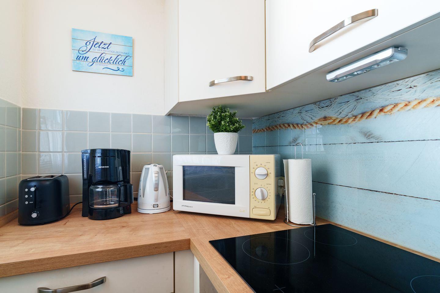 Gut ausgestattete Küche mit reichlich Stauraum, Herd mit Ceranfeld, Backofen, Kühlschrank, Kaffeemaschine, Wasserkocher, Toaster, Fenster