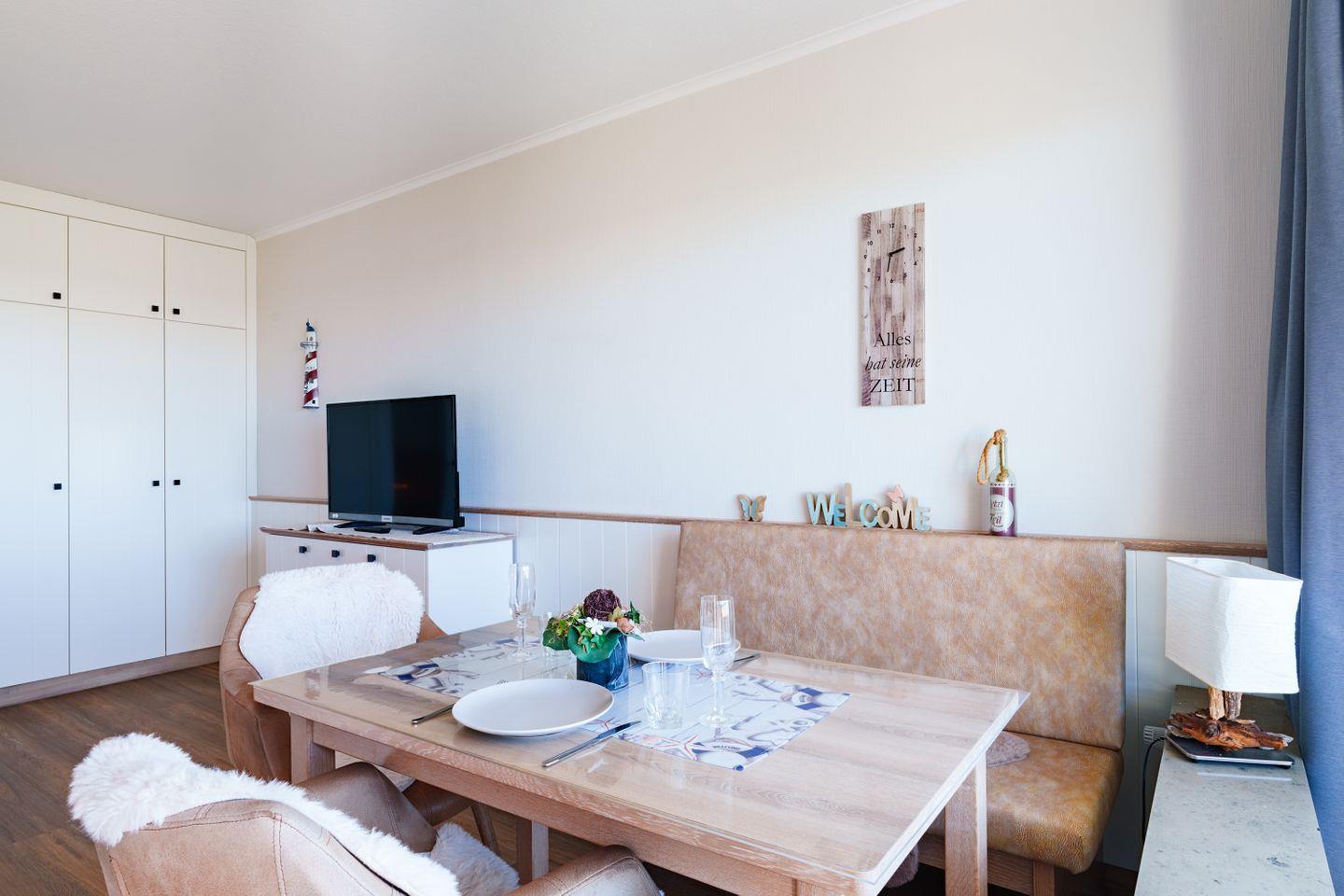 Die voll ausgestattete Küche bietet alles, was Sie für eine kleine Auszeit am Meer benötigen. Der offene Wohn- und Schlafbereich verfügt über eine Essecke mit einer Sitzbank und zwei Sesseln.