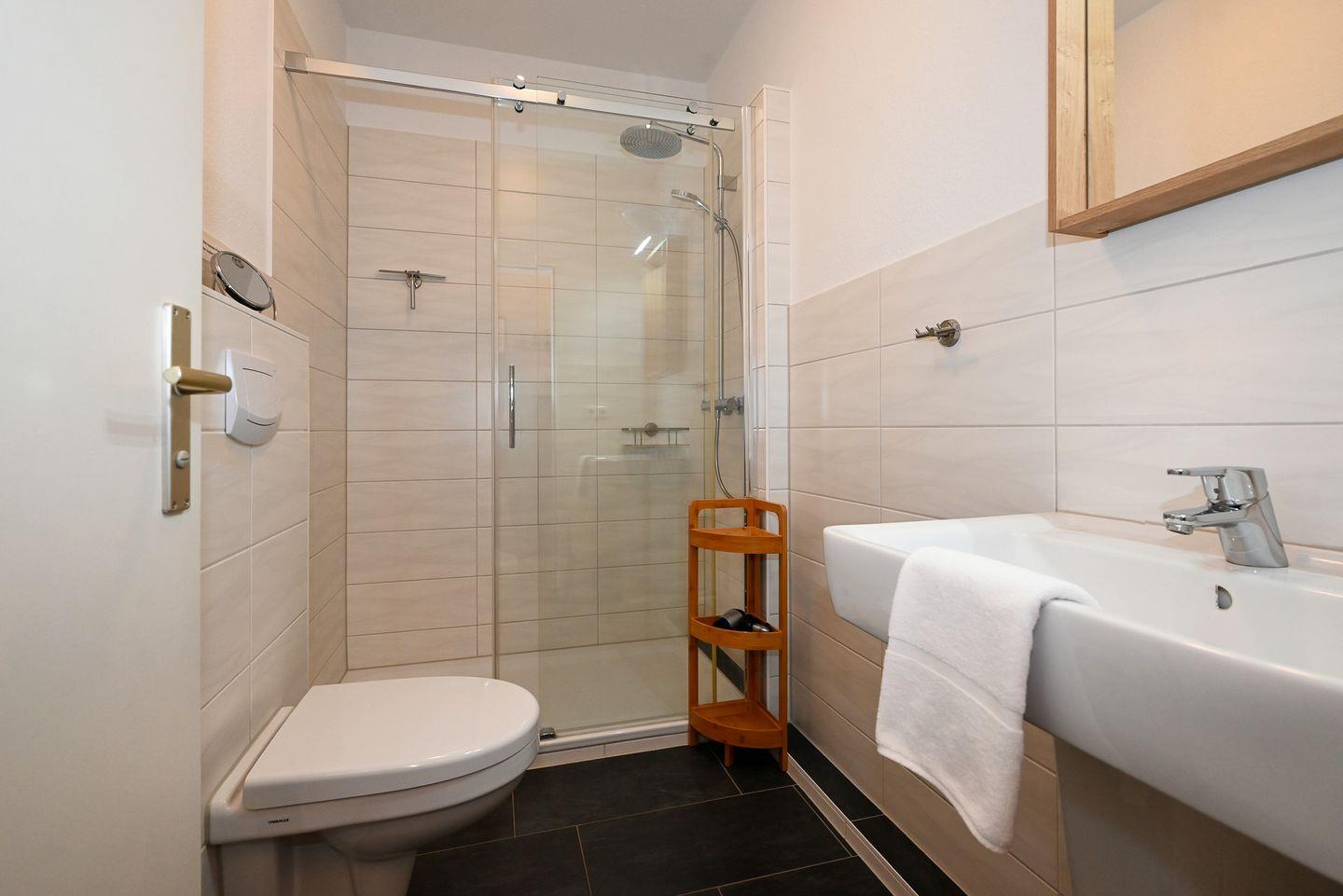 Das Badezimmer ist hell und modern gestaltet. Es bietet eine Dusche mit leichtem Einstieg, der kaum eine Stufe hat, sowie eine angenehme Handtuchheizung, die für wohlige Wärme und Komfort sorgt – besonders an kühleren Tagen.