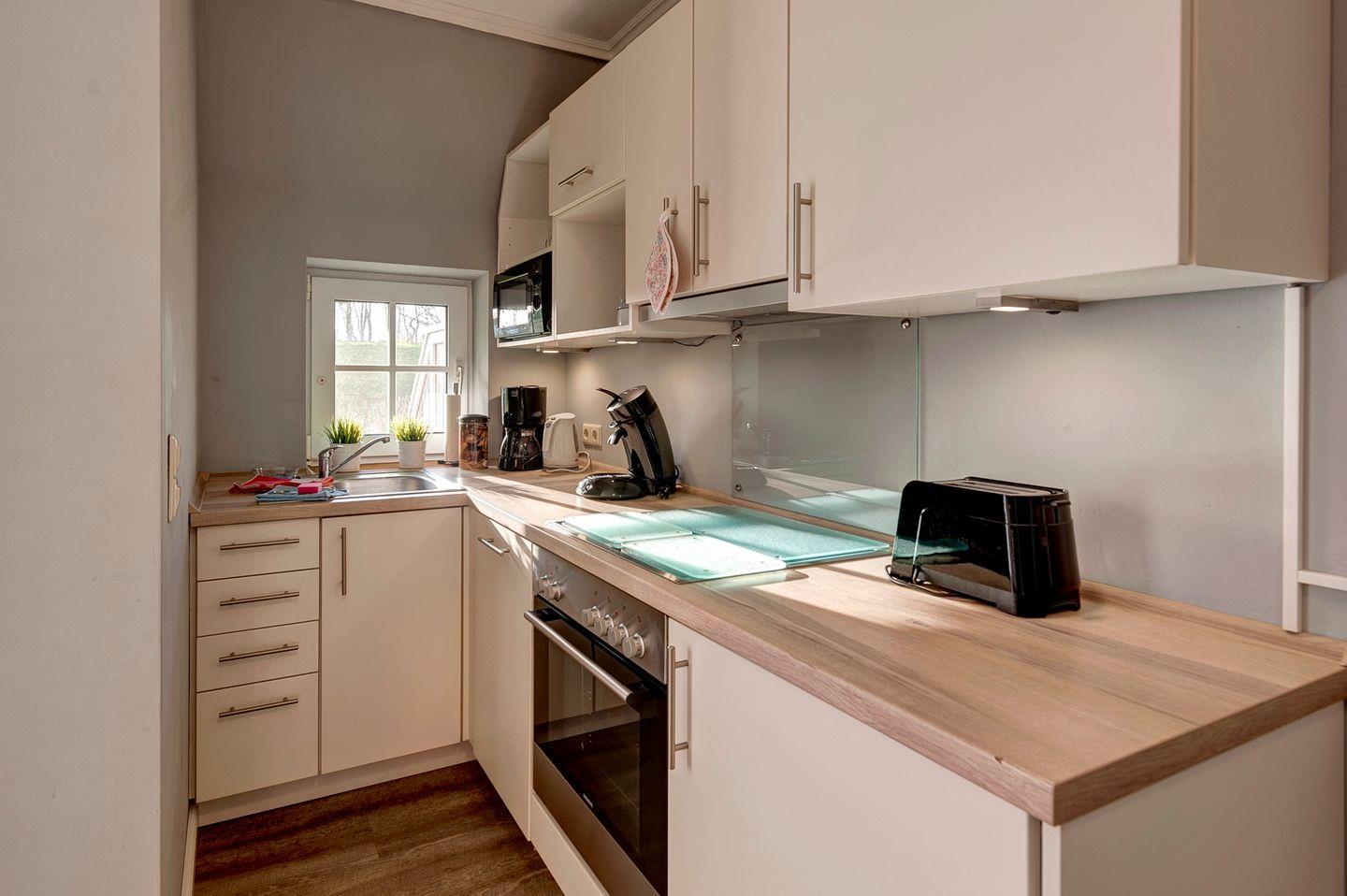 Die offene Küche, die an das Wohnzimmer angrenzt, bietet Ihnen alles, was Sie für die Zubereitung leckerer Mahlzeiten benötigen. Ein Cerankochfeld, ein Backofen, eine Spülmaschine, Mikrowelle, Kühlschrank und Geschirr sind vorhanden, sodass den kulinarischen Abenteuern in Ihrer Unterkunft nichts im Wege steht. Genießen Sie Ihre Mahlzeiten am Esstisch oder auf der überdachten Terrasse, die mit Gartenmöbeln ausgestattet ist und einen herrlichen Blick ins Grüne bietet.
