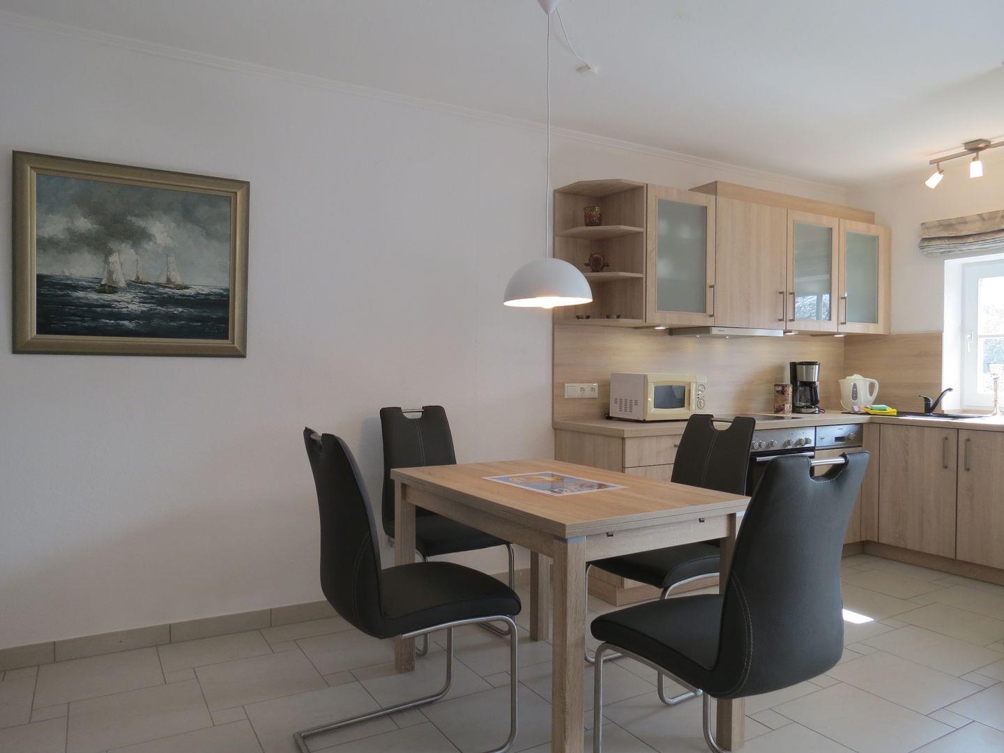 Die offene Küche ist mit modernen Annehmlichkeiten ausgestattet, darunter ein Cerankochfeld, ein Backofen, eine Mikrowelle und eine Spülmaschine. Auch Kühlschrank, Gefrierfach und sämtliche Küchenutensilien sind vorhanden, um Ihre kulinarischen Wünsche zu erfüllen. Genießen Sie frisch zubereitete Speisen auf Ihrer eigenen überdachten Terrasse, die mit Gartenmöbeln, einem Strandkorb und einem Sonnenschirm ausgestattet ist. Hier können Sie die ruhige ländliche Umgebung und die frische Nordseeluft in vollen Zügen genießen.