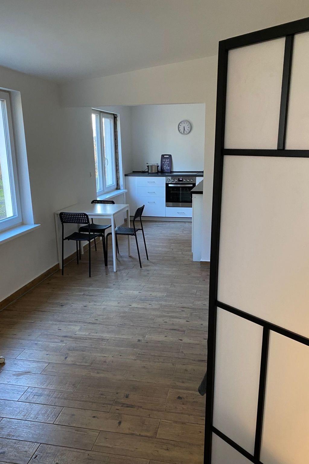 Diese 35 m² große, moderne und offene Wohnung mit Wohn- und Schlafbereich und voll ausgestatteter Küche befindet sich im Erdgeschoss. Die Küche ist mit Ceran-Kochfeld, Backofen, Kühlschrank mit Gefrierfach, Geschirrspüler und Senseo-KaffeePadmaschine ausgestattet. Außerdem gibt es eine "normale" Kaffeemaschine und einen Wasserkocher.Im Bad finden Sie neben dem WC und dem Waschbecken eine Regendusche vor.Im Schlafbereich befindet sich ein Doppelbett (180 x 200).Das Sofa im Wohnbereich kann bei Bedarf in einen Schlafplatz für zwei weitere Personen umgewandelt werden.Die gesamte Wohnung ist mit WLAN-Anschluss Fußbodenheizung und hundefreundlichen, rutschfesten Fliesen ausgestattet.