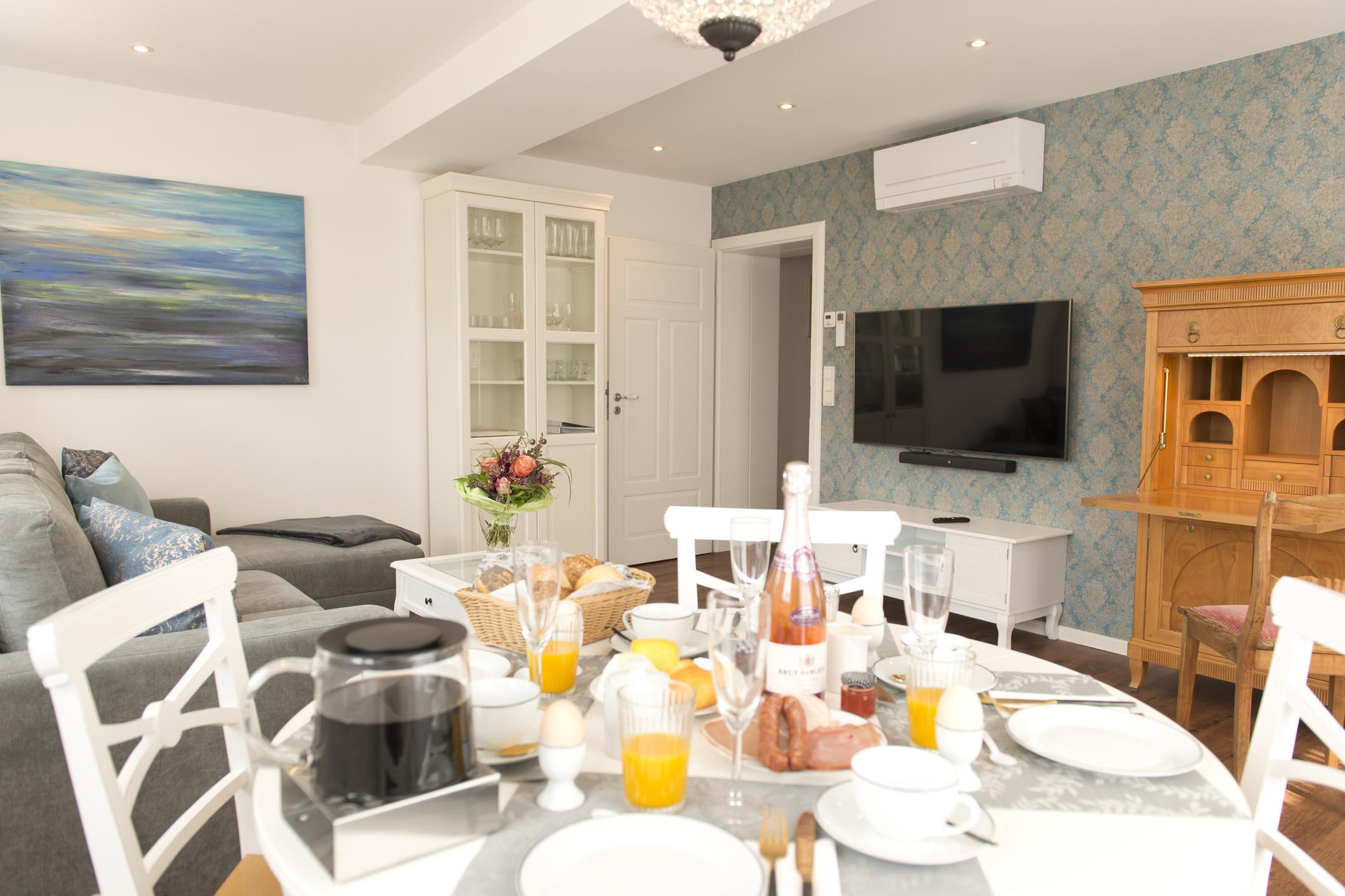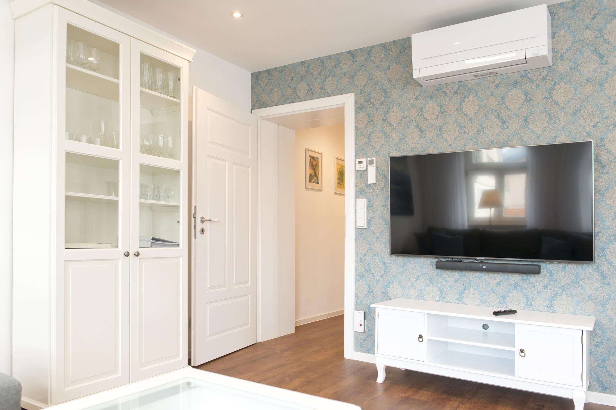 Die komfortable, neu renovierte Wohnung für maximal 3 Gäste ist 60qm groß und hat neben dem großen Wohnzimmer mit einem bequemen Schlafsofa ein Schlafzimmer mit Boxspring-Doppelbett, eine Küche mit Geschirrspüler, Mikrowelle und Multifunktionsbackofen. Waschmaschine und Trockner sind ebenfalls vorhanden. Im Tageslichtbad finden Sie eine Walk-in-Dusche. Ein Gäste-WC ist auch vorhanden. Im Wohn- und Schlafzimmer gibt es eine Klimaanlage.