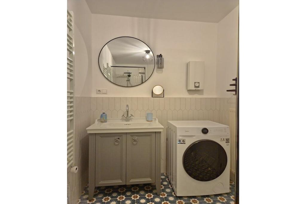 In der 1. Etage: (Wohnzimmer(, Schlafcouch 1 Pers., TV), Schlafzimmer(, , Schlafcouch 1 Pers., Doppelbett), Badezimmer(, Toilette, Dusche, Waschbecken)) , , , , , Küche, Internet, Internet, Erste-Hilfe-Station, Trockner, Waschmaschine, Balkon(Balkon), Parkplatz, Bügelbrett, Bügeleisen, Trockenschrank