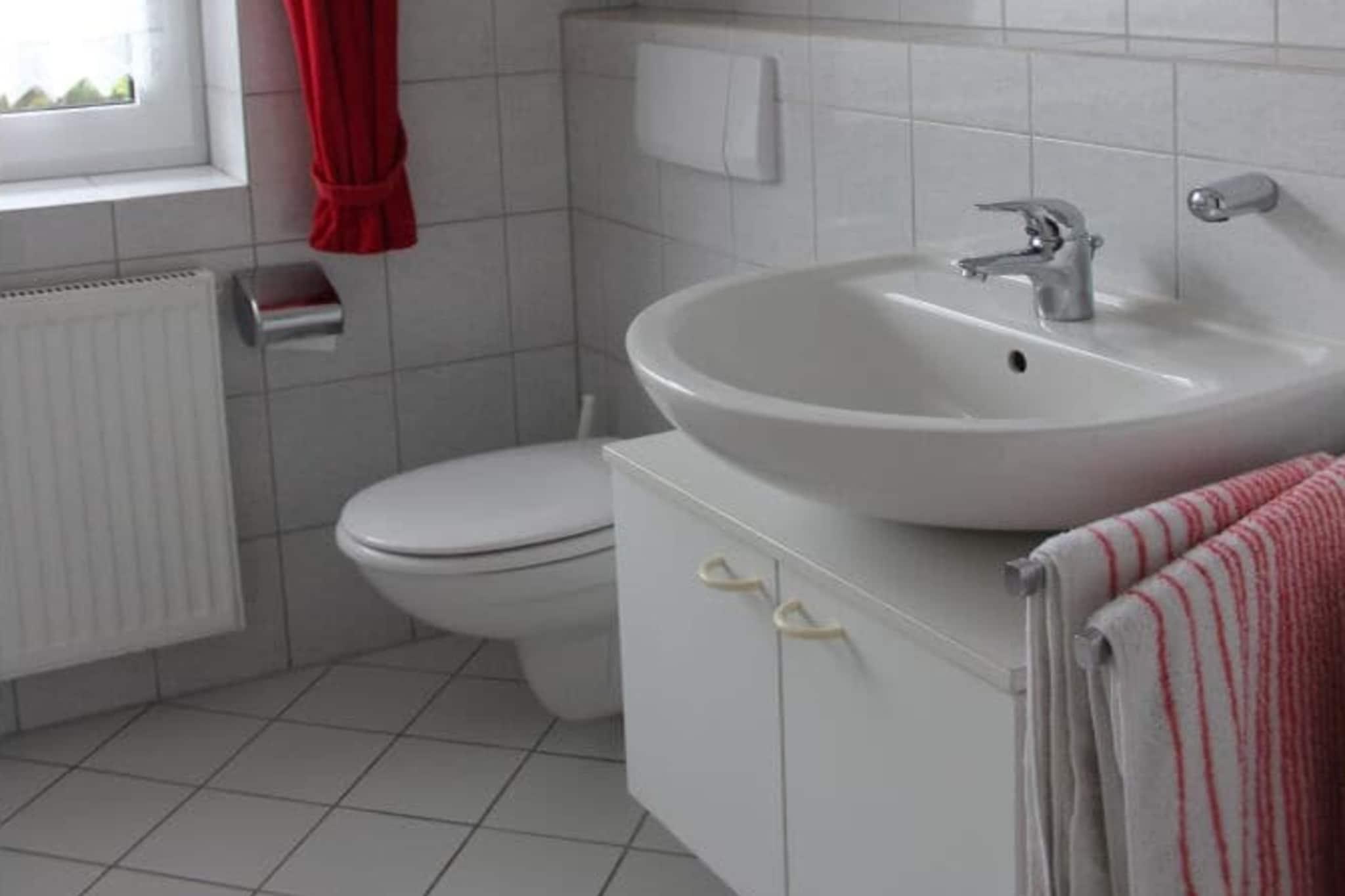 Die große, helle Ferienwohnung im Erdgeschoss eines Zweifamilienhauses mit 87 qm bietet Ihnen 2 Schlafzimmer, ein Wohnzimmer, eine gesonderte Essdiele, Küche, Badezimmer und einen Garten mit Terrasse. Ein Zustellbett für Erwachsene und auch für Kleinkinder, ebenso ein Kinderstuhl können auf Anfrage bereitgestellt werden. Im geräumigen Wohnzimmer befinden sich ein Flachbild-TV mit Kabelanschluss, eine Stereoanlage, sowie Telefon und Internetzugang über WLAN. Jedes Schlafzimmer ist zudem mit einem eigenen Flachbild-TV ausgestattet. Das Badezimmer weißt ein ebenerdiges Duschbad mit Trockner und Waschmaschine aus. Die mit Gartenmöbeln ausgestattete Terrasse und den Garten erreichen Sie über das Wohnzimmer. Sämtliche Fenster haben elektrische Rollläden. Es wird ein Kurzzeitaufschlag bei Buchungen von 4-6 Nächten erhoben.