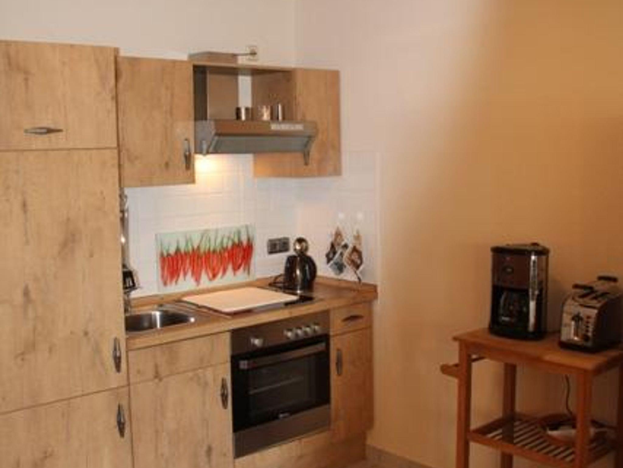 Das Appartement vereint Wohnen, Essen, Kochen und Schlafen in harmonischer Weise. Die Küche verfügt über einen Hochkühlschrank mit Gefrierfach, Herd, Backofen, Wasserkocher, Kaffeemaschine und Toaster. Das Doppelbett, 200 x 180, hat getrennte Matratzen.