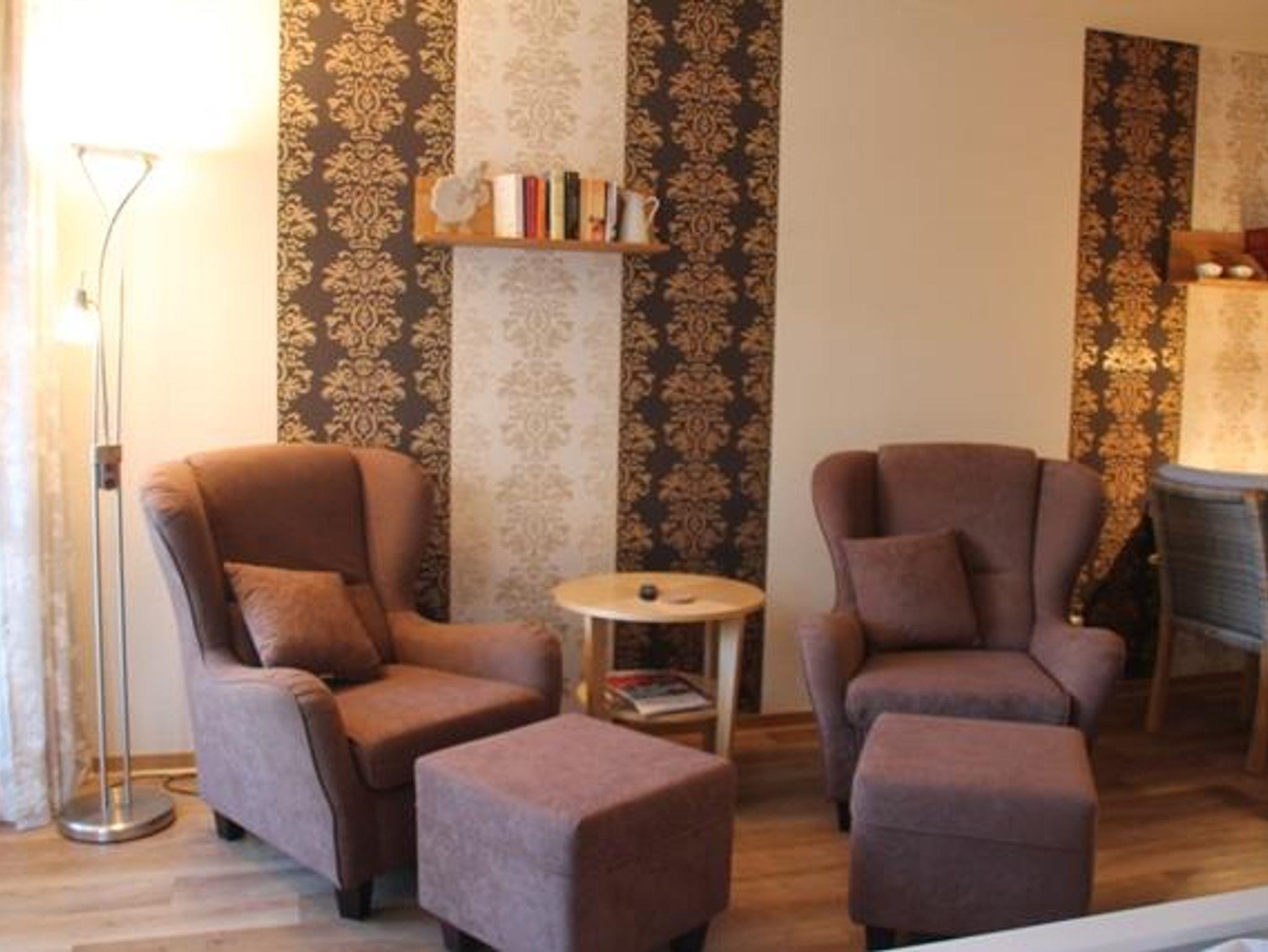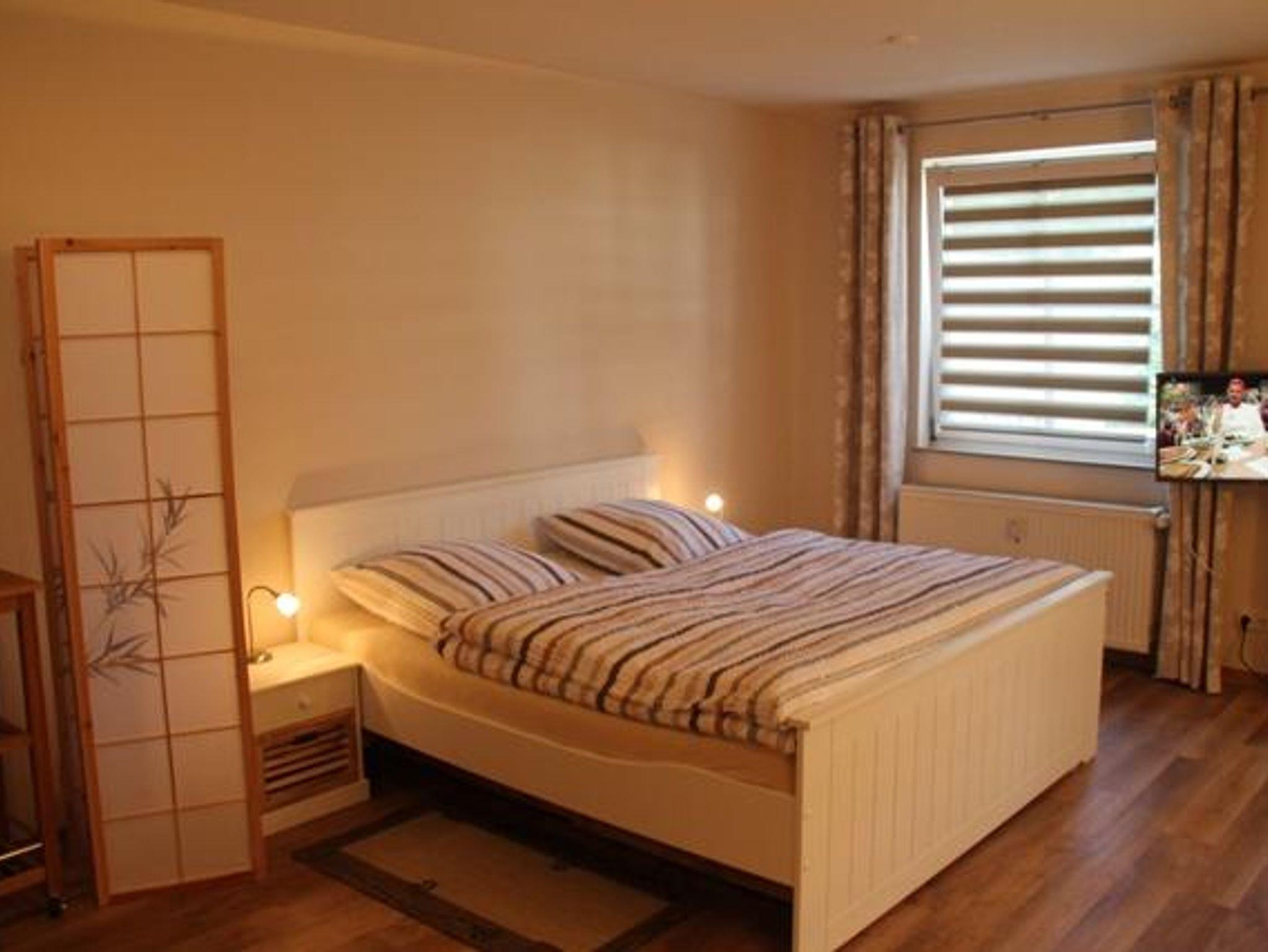 Der Fernseh-Flachbildschirm ist 80 cm breit. Er ist schwenkbar an die Wand montiert und ermöglicht Ihnen, sowohl von den bequemen Sesseln mit Fußhockern, als auch von der Essecke oder sogar dem Bett Ihre Lieblingssendung zu schauen. Ein Radio versorgt Sie mit Musik und Nachrichten, Internetzugang bekommen Sie über WLAN.
