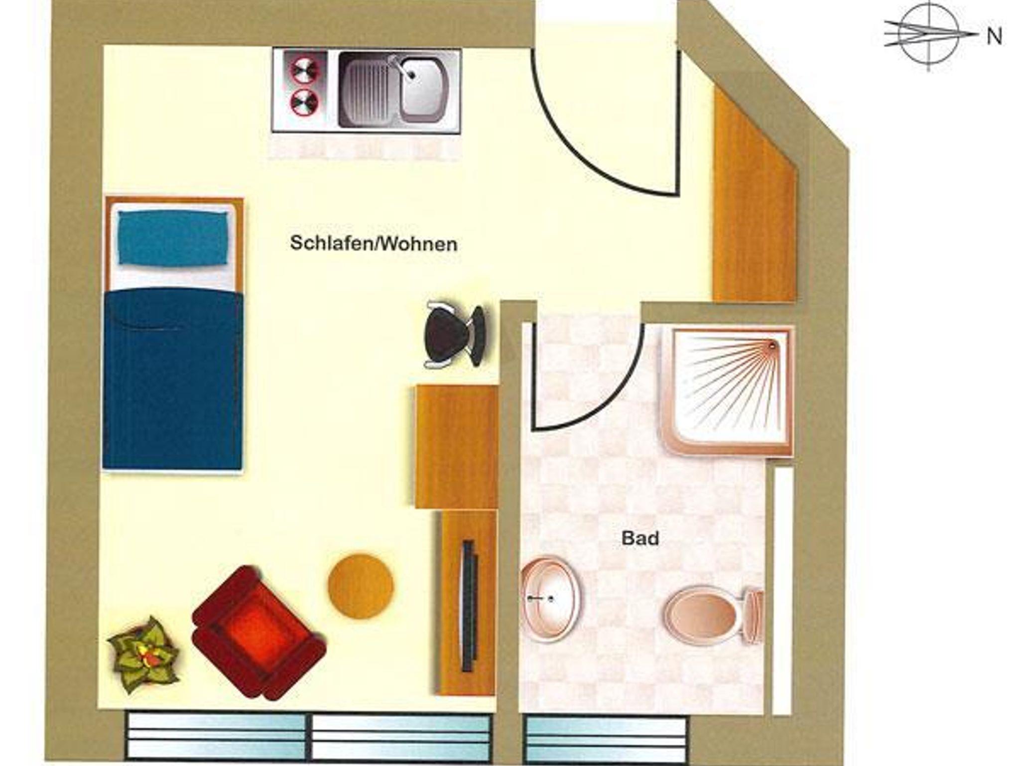 Klein aber oho! Diese Wohnung mit ca.15 qm liegt im Erdgeschoss und bietet für eine Person einen gemütlichen Wohn-Schlafraum mit einer Küchen-Pantry. Hat sie das Badezimmer überrascht?