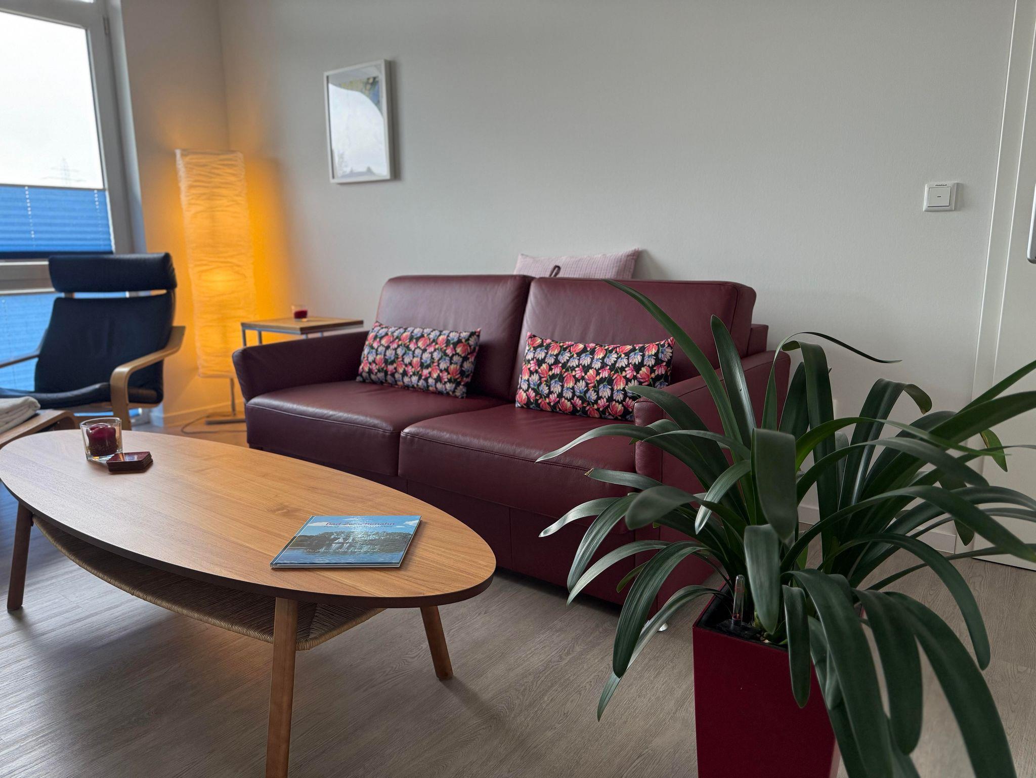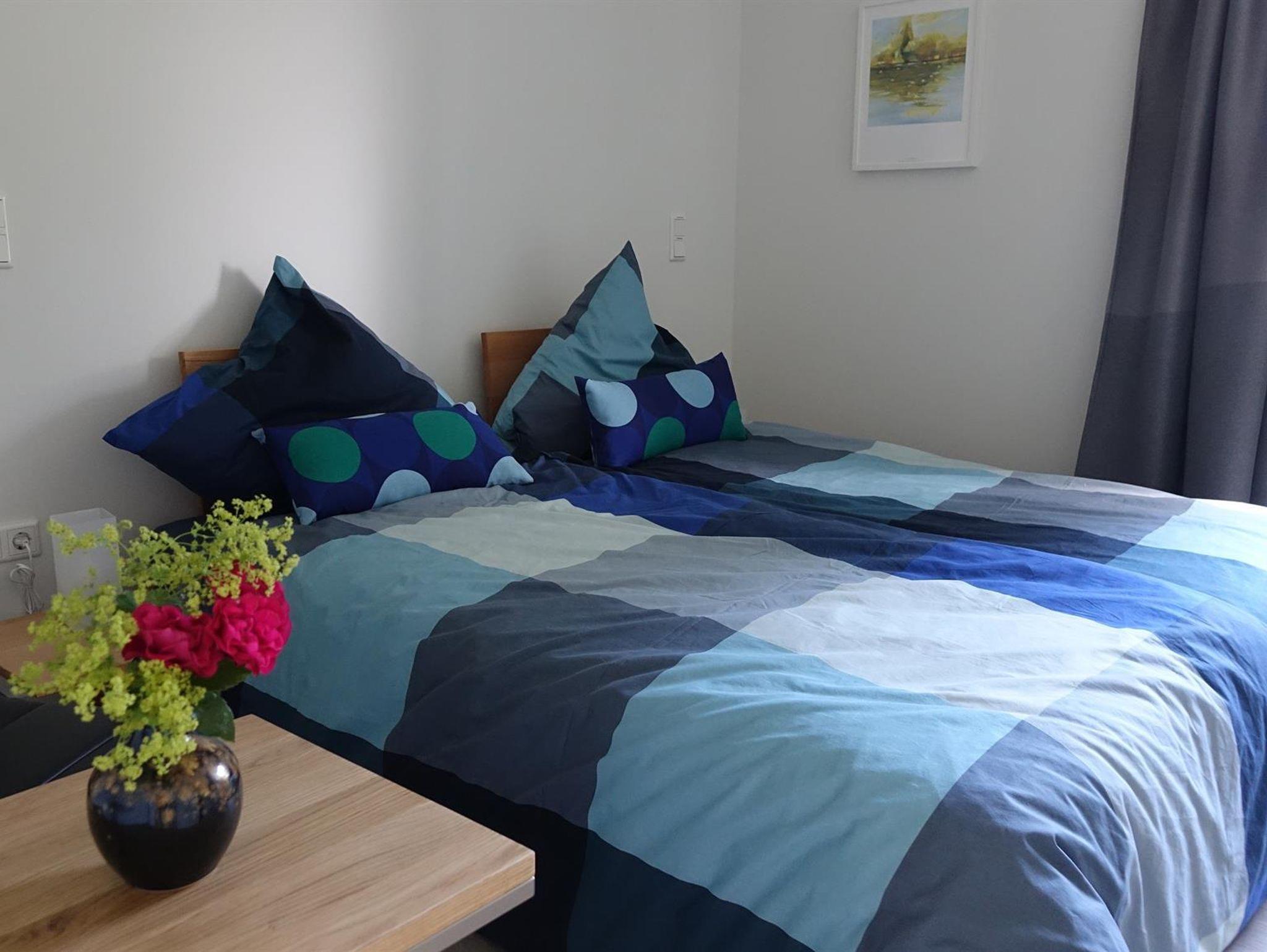 Die Ferienwohnung hat zwei Zimmer, Küche, Bad und einen Platz im Freien – eine Dachterrasse mit Grill. Das Schlafzimmer ist mit einem Doppelbett (180 x 200 cm, Allergiker-geeignet mit milbendichtem Matratzenbezug) ausgestattet. Hinter dem Schlafzimmer ist eine geräumige Kammer, in der Sie Ihre Koffer abstellen können. Das Sofa im Wohnzimmer lässt sich zu einer Schlafcouch (130 x 200 cm) verwandeln, so dass auch bis zu vier Personen hier übernachten können.