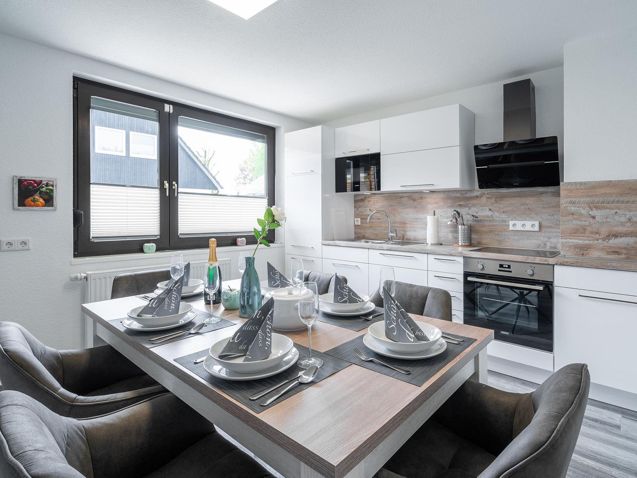 Das Ferienhaus verfügt über 6 Schlafplätze. Die Küche bietet alle Annehmlichkeiten für gemütliche Kochabende, inkl. Backofen. Genießen Sie das gemeinsame Frühstück oder den Sonnenuntergang auf der geräumigen Terrasse.