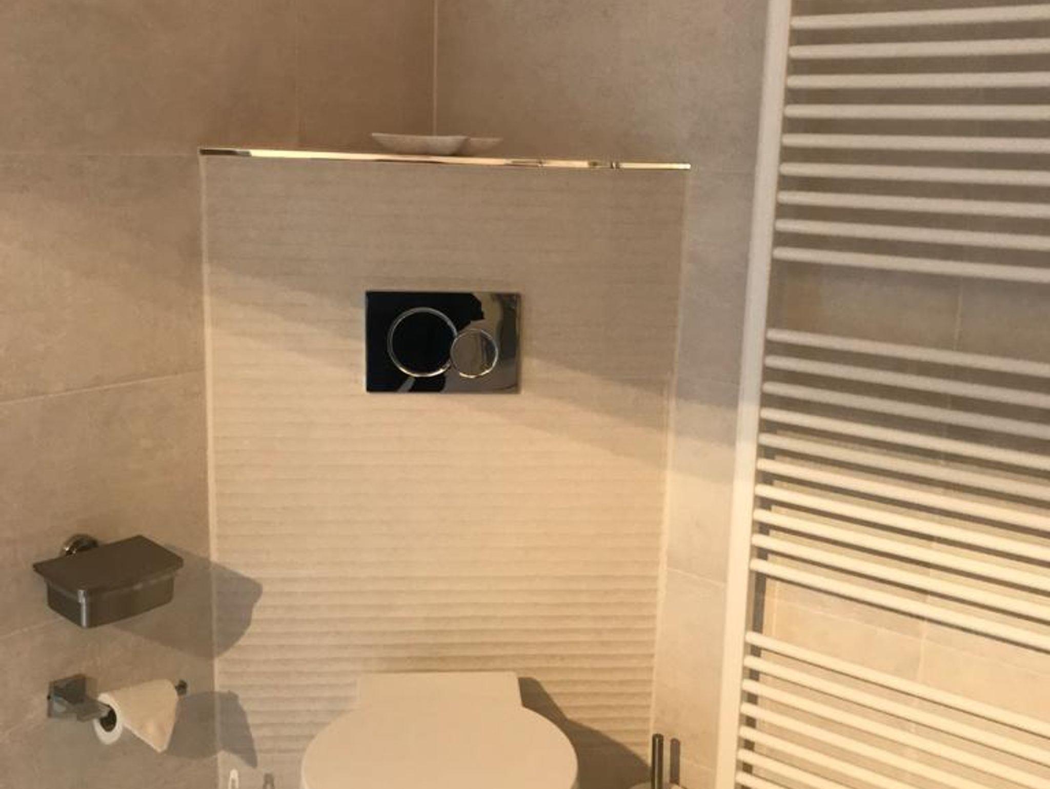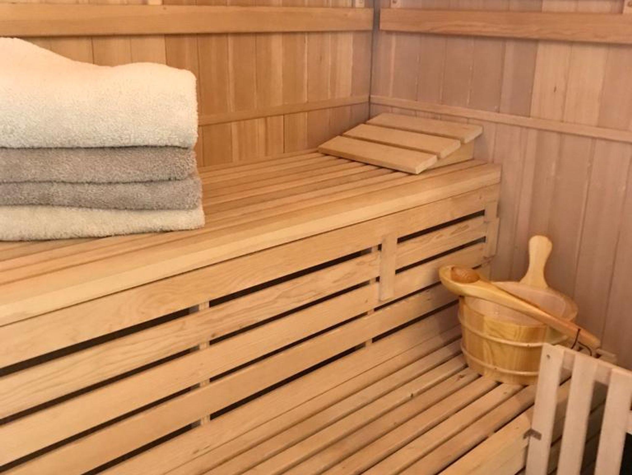 Im angrenzenden Bad mit Fußbodenheizung erwartet Sie eine schöne Glassauna, in der Sie die Seele baumeln lassen können.