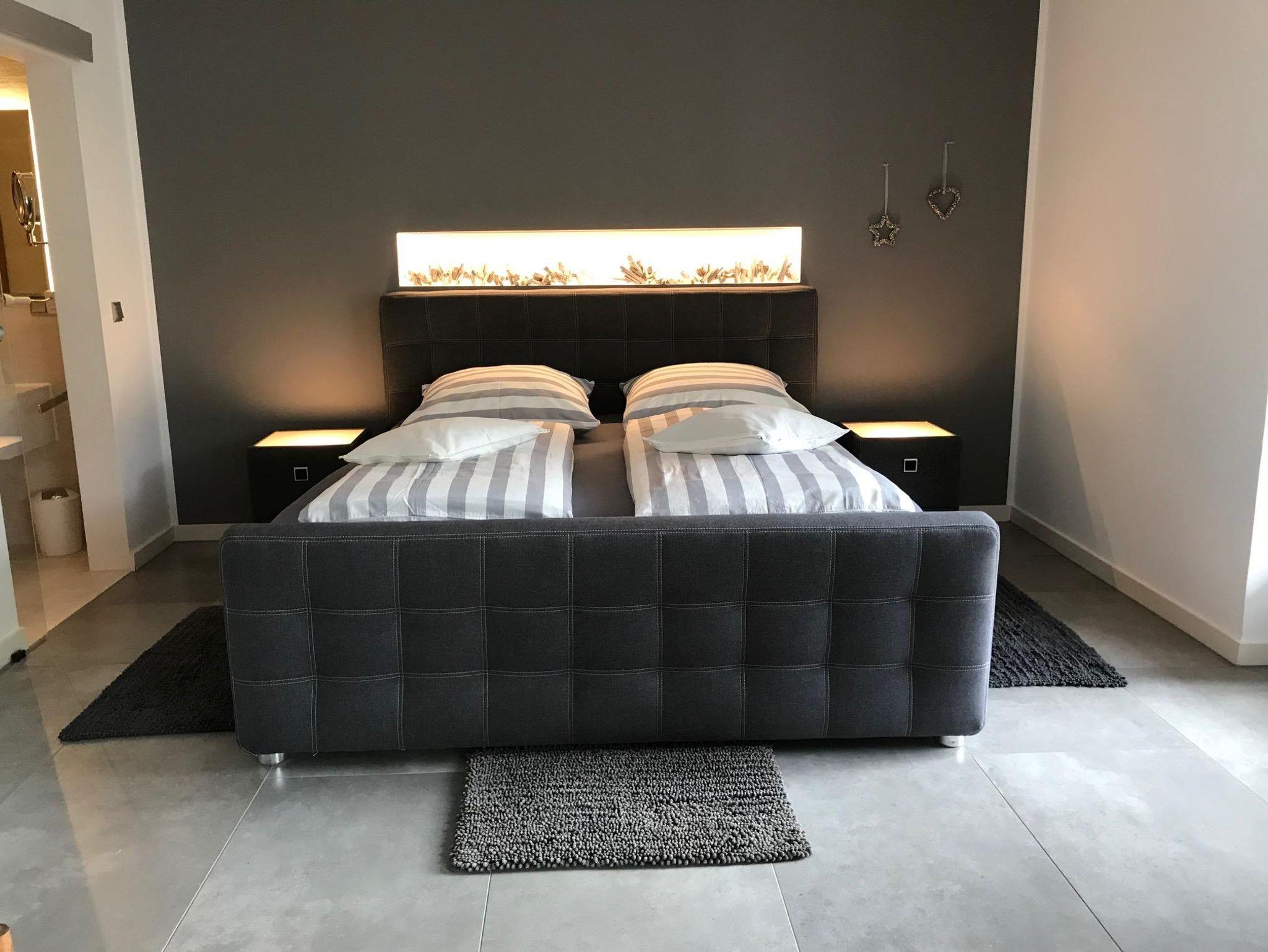 Das Schlafzimmer ist augrstattet mit einem großzügiges Boxspringbett,