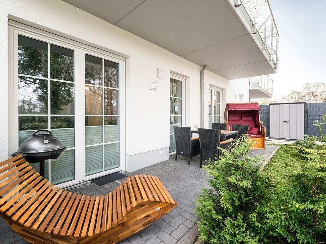 Im Garten steht für Sie ein Grill, eine Sitzgruppe, eine Gartenliege sowie ein Strandkorb und Sonnenschrim bereit.