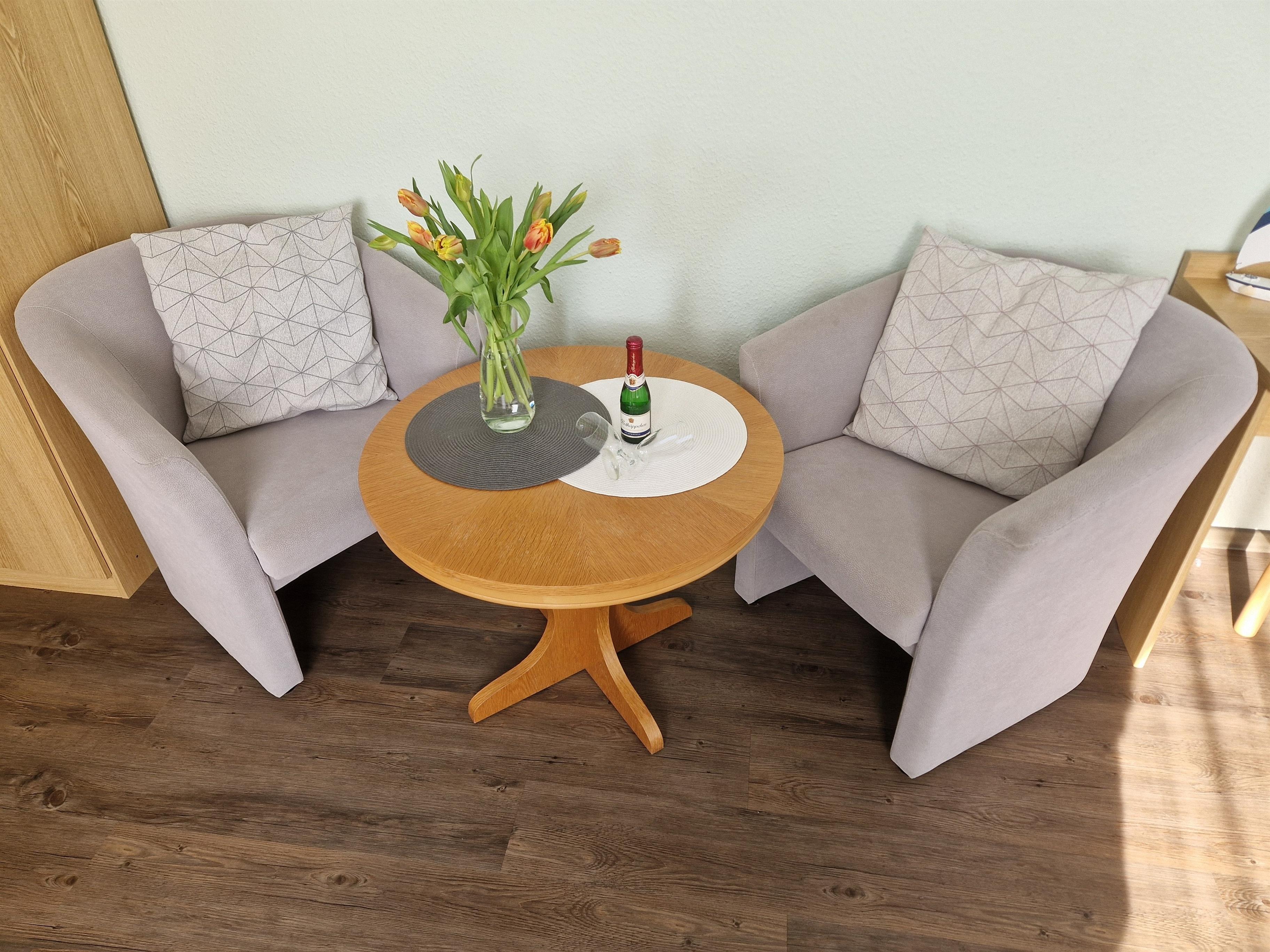 Der gemütliche Wohn-Schlafraum ist praktisch eingerichtet und bietet Ihnen sowohl Platz zum Entspannen auf unseren bequemen Lounge-Sesseln als auch einen Schreibtisch, der Raum für kreative Ideen schafft.