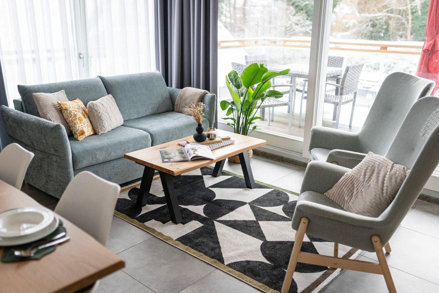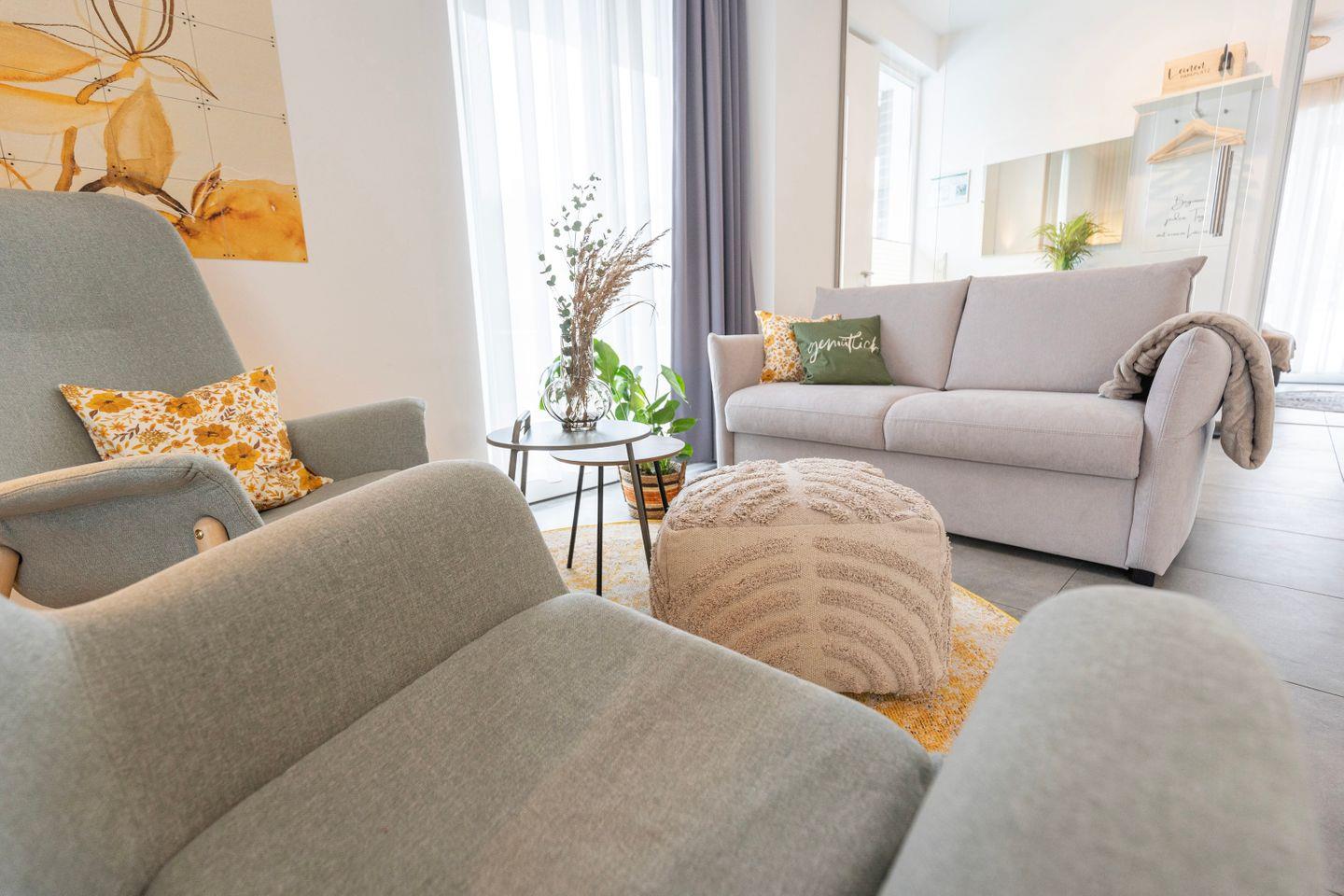 In den Wohnzimmern wartet neben einer gemütlichen Schlafcouch und einer einladenden Sitzecke mit Sofa und TV auch ein Arbeitsplatz mit Schreibtisch und schnellem WLAN auf dich – falls du doch mal ein paar Dinge erledigen musst.