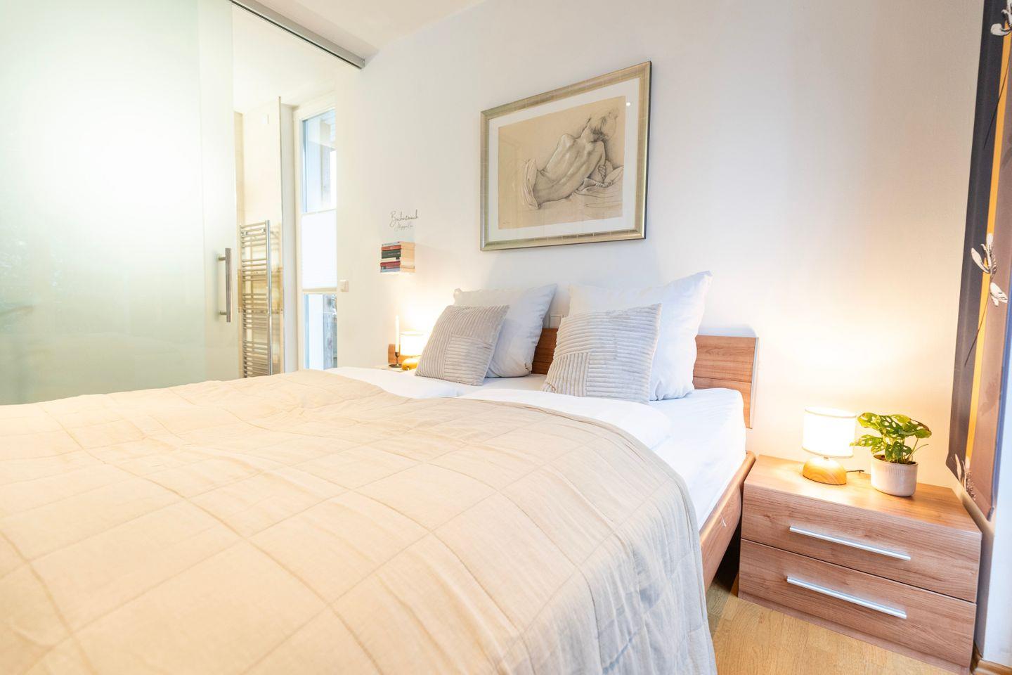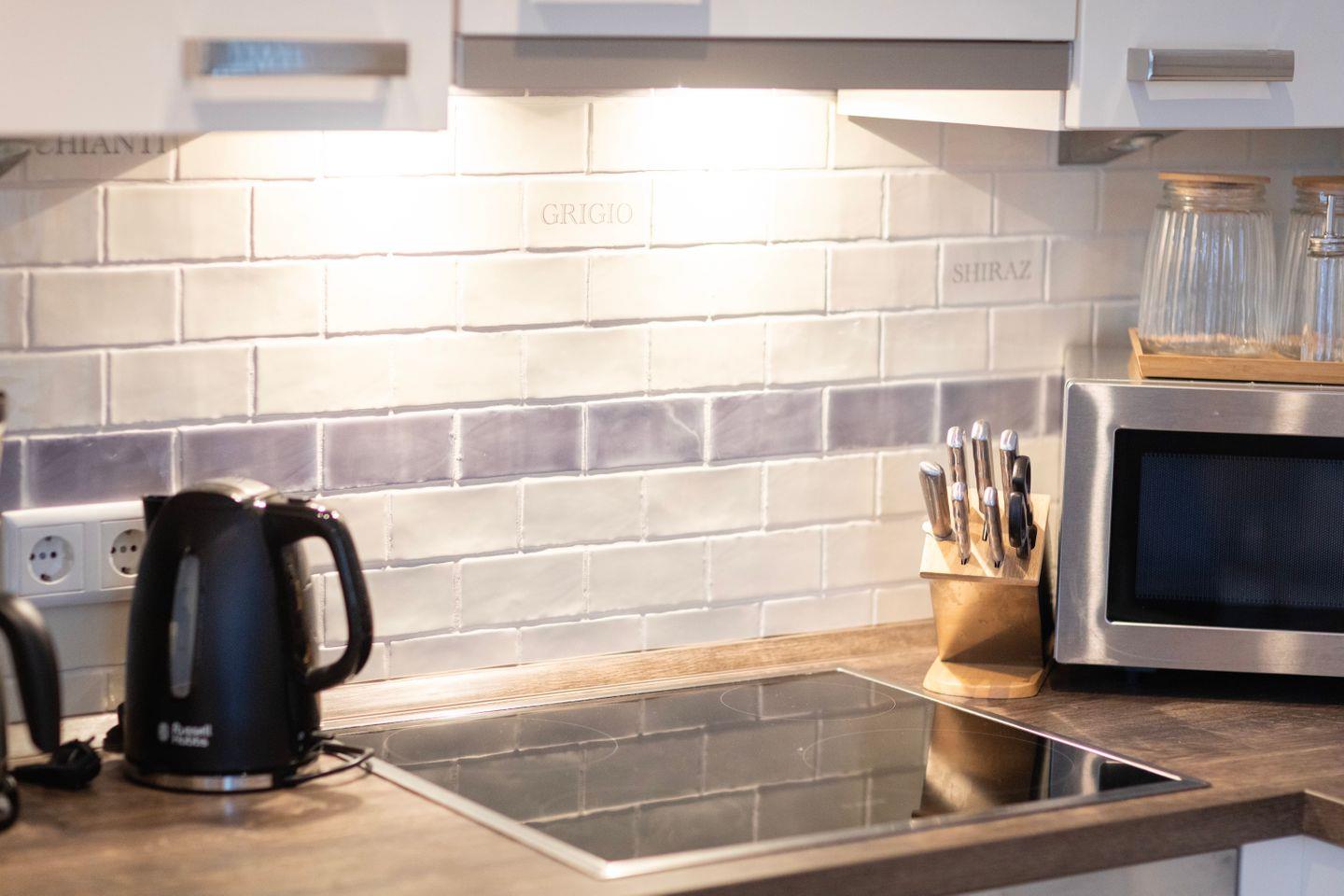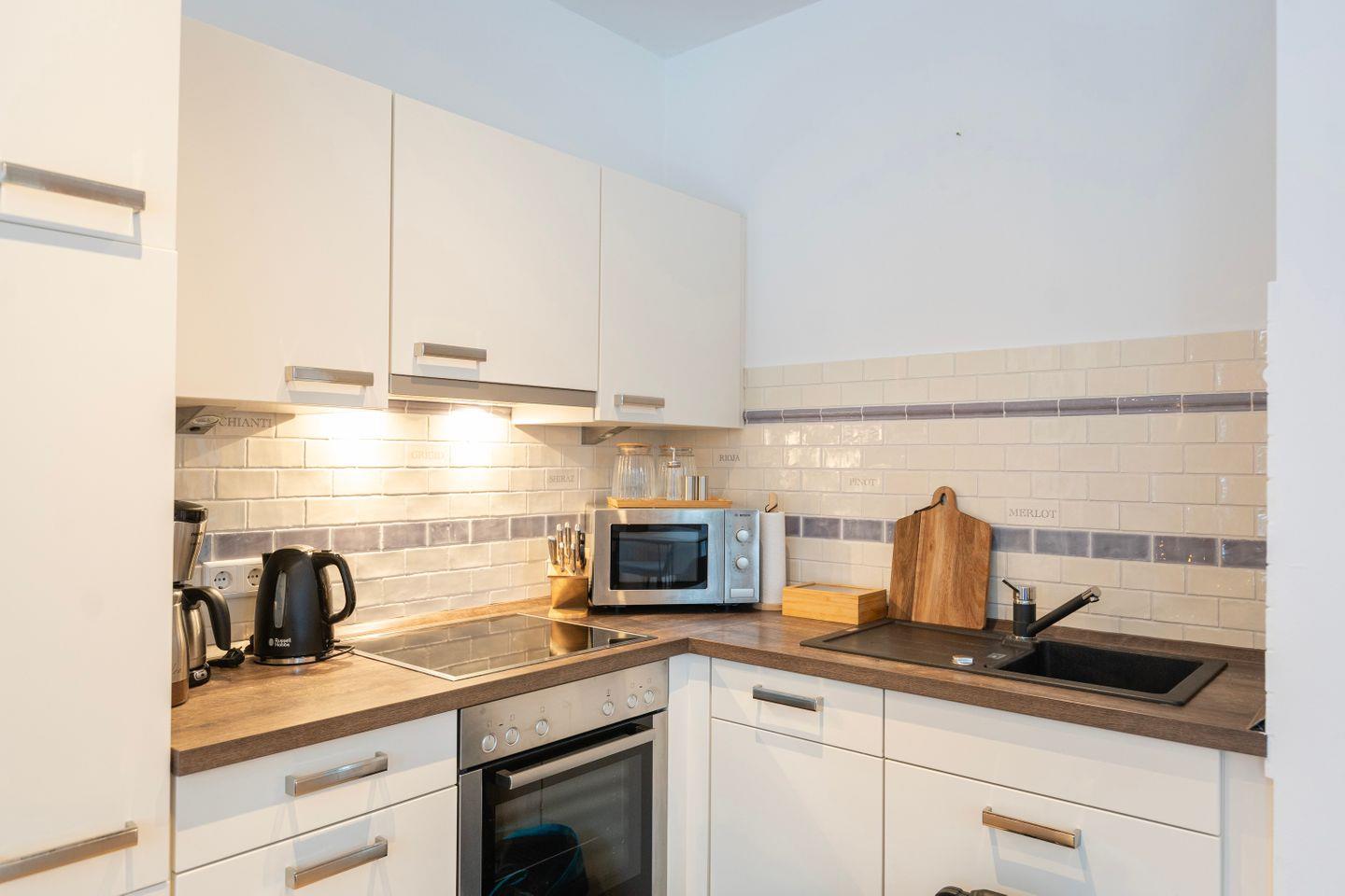 Die Küche ist natürlich voll ausgestattet mit Herd, Kühlschrank, Backofen, Spülmaschine, Mikrowelle und allem was Du sonst brauchst um lecker zu kochen. Das Apartment verfügt ebenso über eine Waschmaschine.