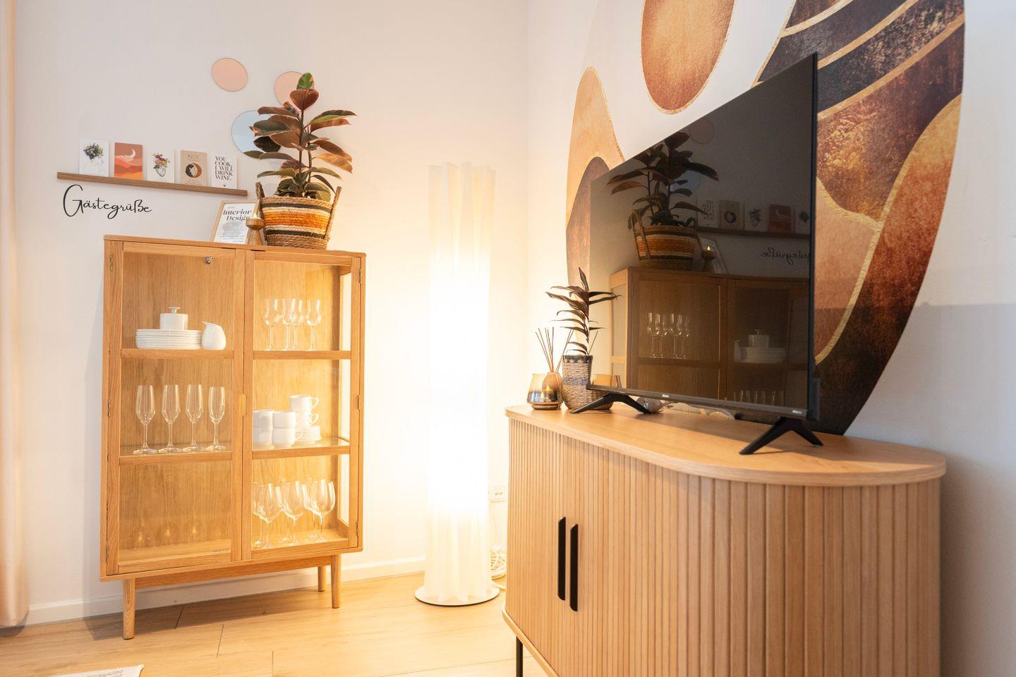 Das Schlafzimmer verfügt über ein gemütliches 1,80m Doppelbett. Im Wohnzimmer findest Du nicht nur hochwertige Schlafcouch, die sich perfekt für Familienbesuche eignet, sondern ebenso einen großen Essbereich für 4 Personen sowie einen gemütlichen Sitzbereich mit Sofa und einem TV. Hier ist sowohl Raum für einen gemütlichen Fernsehabend, wie auch die Möglichkeit eines Spieleabends mit deinen Liebsten.