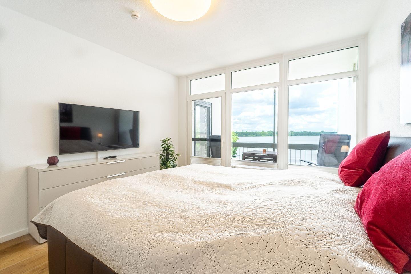 Das Highlight der Wohnung ist zweifellos die große Fensterfront, die Dir einen atemberaubenden Blick auf das Zwischenahner Meer bietet. Genieße dieses einzigartige Panorama vom Wohnzimmer oder direkt von Deiner eigenen Loggia aus, ausgestattet mit einem Essbereich und Liegestühlen. Dein Schlafzimmer ist der ideale Rückzugsort nach einem ereignisreichen Tag. Hier findest Du einen weiteren Fernseher und ein komfortables Bett für erholsame Nächte.